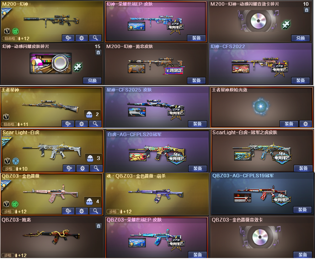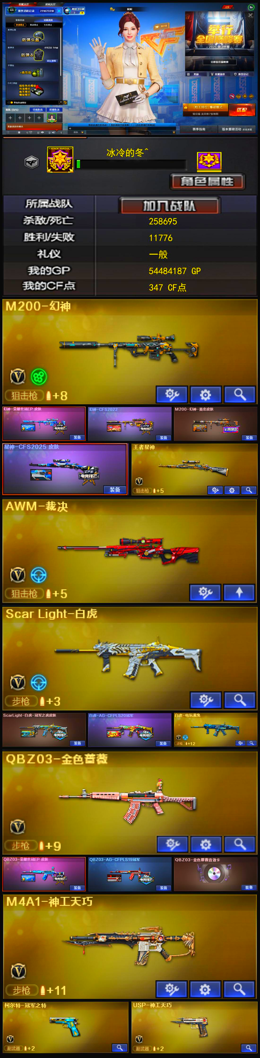 【广东一区】【可排位】【枪王1】【V武器数59】【幻神3皮】【金色蔷薇三件套】【神工天巧套装X2套】【雷暴套装X1套】【M200-幻神】【幻神-荣耀世冠EP 皮肤】【幻神-CFS2022】【M200-幻神-黄忠皮肤】【星神-CFS2025 皮肤】【王者星神-觉醒版】【AWM-裁决】【Scar Light-白虎】【ScarLight-白虎-冠军之虎皮肤】【白虎-AG-CFPLS20冠军】【白虎-电玩蓝兔】【QBZ03-金色蔷薇】【QBZ03-AG-CFPLS19冠军】【QBZ03-金色蔷薇音效卡】【M4A1-神工天巧】【柯尔特-冠军之特】【USP-神工天巧】【魂·炼狱-玩具枪】【兰-巾帼英雄】【奇洋探员】【乔伊教练】【王者春】【修道士】【M4A1-雷神】【雷神-荣耀之魄】【雷神-宠儿-2019MVP】【M4A1-雷神-CFS 2019】【雷神-赛博朋克】【AK47-火麒麟】【火麒麟-战神关羽】【火麒麟-平天大圣】【火麒麟-心动糖果】【火麒麟-CFSTAR】【M4A1-黑骑士】【黑骑士-摸金校尉】【黑骑士-摸金校尉】【M4A1-黑骑士音效卡】【黑龙-能量核心】【Barrett-毁灭】【毁灭-荣耀之怒】【毁灭-星空】【毁灭-直播专属 】【Barrett-毁灭音效卡】;柯尔特-冠军之特,妮妮,QBZ03-金色蔷薇,M200-幻神,Scar Light-白虎,