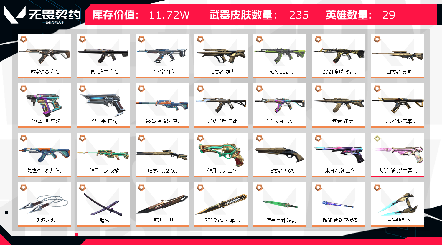 11.7万库存4神话挂饰21冠军25冠军光明哨兵显卡盖亚吱吱特工队;黑波之刃,镭切,威龙之刃,归零者 獠犬,盖亚的复仇 狂徒,虚空遗器 狂徒,掠影 戍卫,
