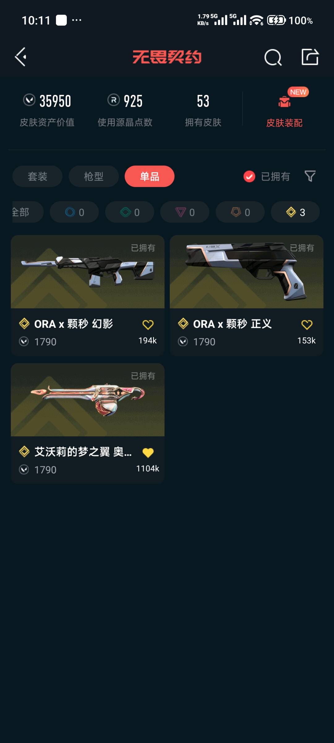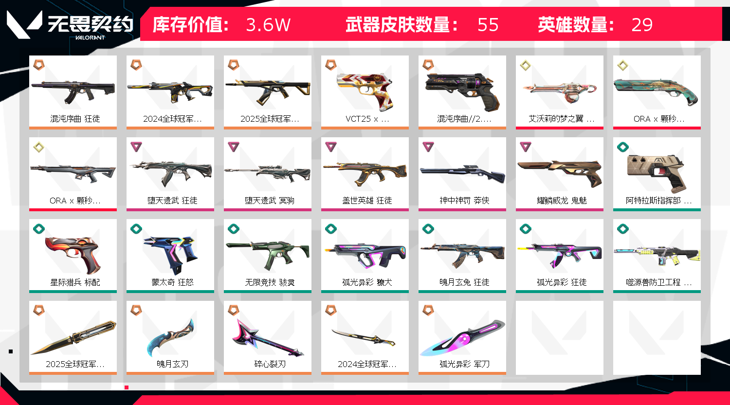 这款账号皮肤资产价值拉满,赛事限定、联名珍稀皮肤齐全,手感与颜值双在线,体验直接拉满! 账号核心信息 - 皮肤资产价值:35950 ​ - 可用源晶点数:925 ​ - 拥有皮肤总数:53款 ​ - 珍稀皮肤等级:黄金级单品3款、橙级单品10款 亮点皮肤清单 1.黄金级稀缺单品:ORA x 颗秒 幻影、ORA x 颗秒 正义、艾沃莉的梦之翼 奥丁 ​ 2.赛事/联名限定:VCT25 x EDG 标配、2024/2025全球冠军赛全系列皮肤 ​ 3.热门典藏皮肤:混沌序曲//2.0 正义、混沌序曲 狂徒、碎心裂刃、弧光异彩军刀、魄月玄刃等;艾沃莉的梦之翼 奥丁,堕天遗武 狂徒,混沌序曲 狂徒,2024全球冠军赛 幻影,堕天遗武 冥驹,