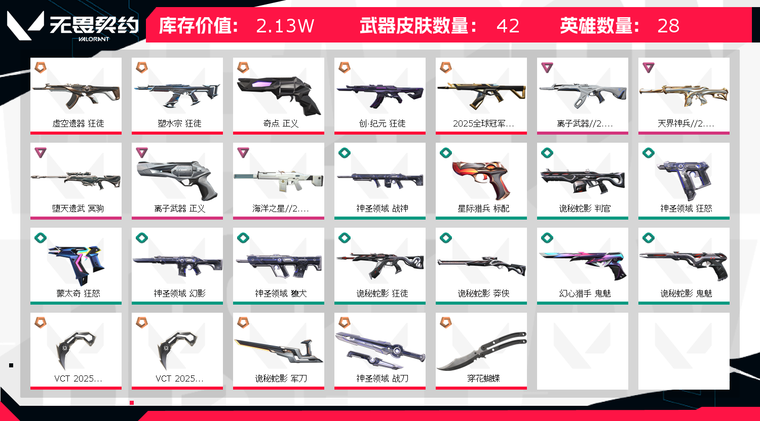 冻结请点击协助,会自动解冻,等几分钟重新登陆即可! 请勿挂机,游戏中挂机拉黑!!! 账号R点请勿使用,本店铺及时补充新套装,若使用R点无法升级新套装,攒R点辛苦,望谅解! 老板不要杀太多,现在风控的严重,杀多了会临时冻结,到时候我可能不在无法解冻!使用外挂脚本导致游戏账号封禁直接向平台提取ip地址! 本账号经过网络财产备案,一经发现直接报警处理立案追责,根据账号价值全额赔偿感谢支持谢谢合作谢谢合作!!!!禁止利用账号进行开挂、使用辅助违规软件诈骗等违规操作!;VCT 2025 爪刀,天界神兵//2.0 幻影,虚空遗器 狂徒,塑水宗 狂徒,离子武器//2.0 狂徒,堕天遗武 冥驹,奇点 正义,