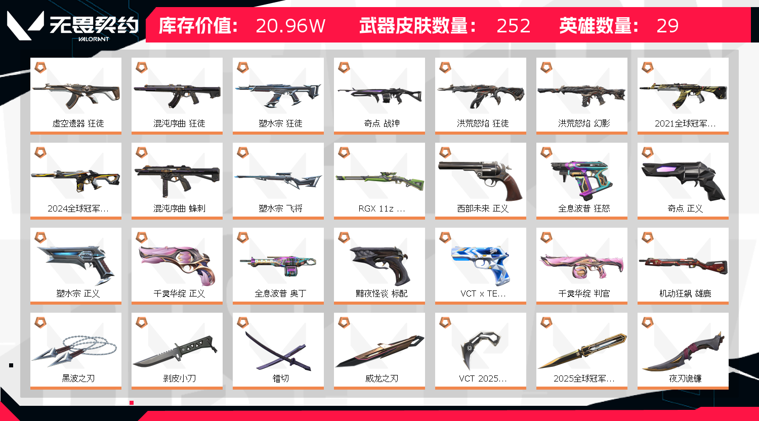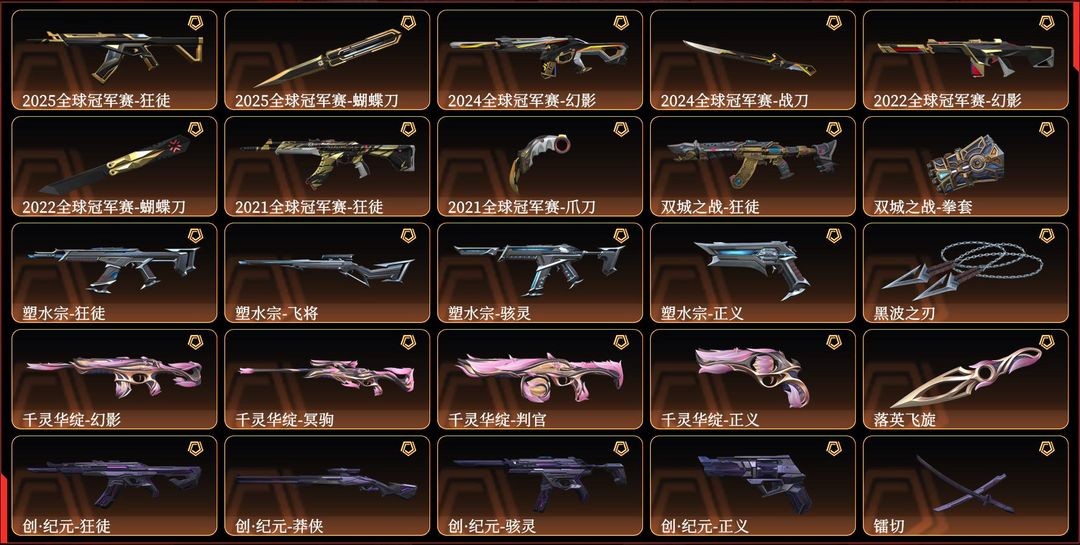 【拥有套装】2022全球冠军赛套装(2022全球冠军赛-幻影,2022全球冠军赛-蝴蝶刀)创纪元套装(创·纪元-狂徒,创·纪元-莽侠,创·纪元-骇灵,创·纪元-正义,镭切)双城之战套装(双城之战-狂徒,双城之战-拳套)千灵华绽套装(千灵华绽-幻影,千灵华绽-冥驹,千灵华绽-判官,千灵华绽--正义,落英飞旋)破败军械套装(破败军械-幻影,破败军械-戍卫,破败军械-骇灵,破败军械-鬼魅,破败王者之残刃)塑水宗套装(塑水宗-骇灵,塑水宗-狂徒,塑水宗-飞将,塑水宗-正义,黑波之刃)奇点2.0套装(奇点//2.0-狂徒,奇点//2.0-鬼魅,奇点//2.0-蝴蝶刀)2025全球冠军赛套装(2025全球冠军赛-狂徒,2025全球冠军赛-蝴蝶刀