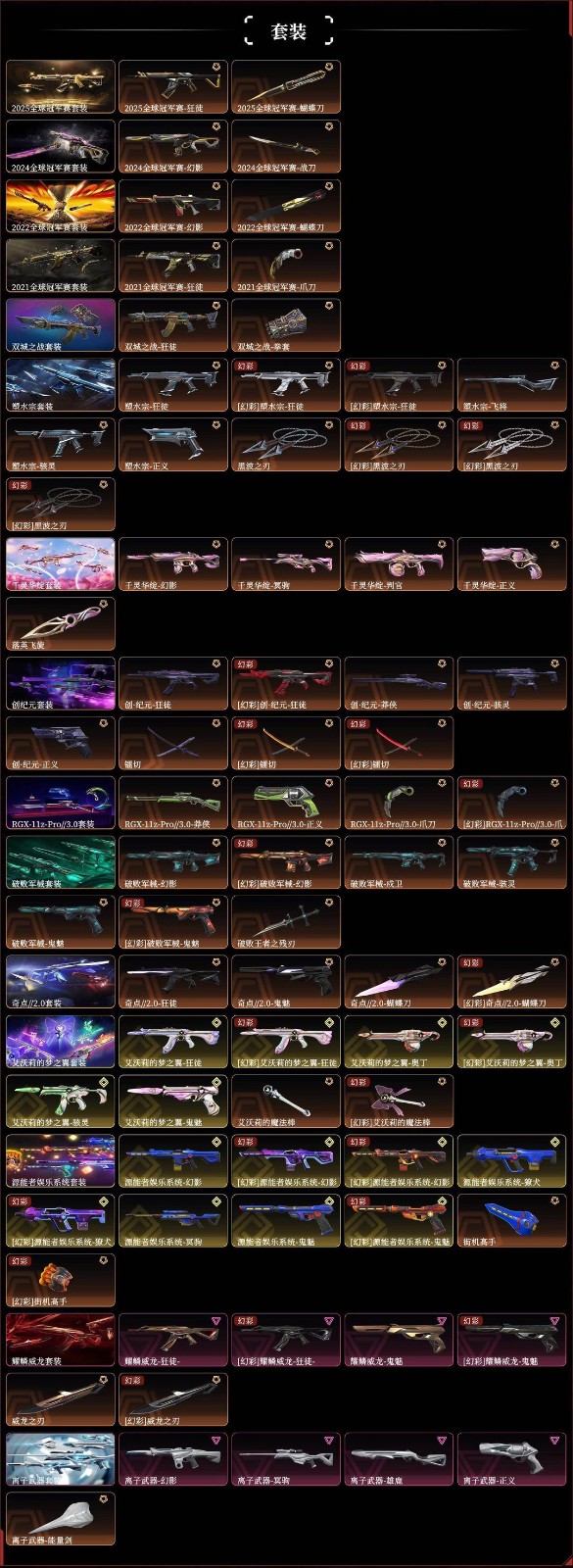 )2024全球冠军赛套装(2024全球冠军赛-幻影,2024全球冠军赛-战刀)2021全球冠军赛套装(2021全球冠军赛-狂徒,2021全球冠军赛-爪刀)RGX-11z-Pro//3.0套装(RGX-11z-Pro//3.0-莽侠,RGX-11z-Pro//3.0-正义,RGX-11z-Pro//3.0-爪刀)耀鳞威龙套装(耀鳞威龙-狂徒,耀鳞威龙-鬼魅,;艾沃莉的梦之翼 奥丁,奇点 战神,黑波之刃,剥皮小刀,镭切,威龙之刃,VCT 2025 爪刀,