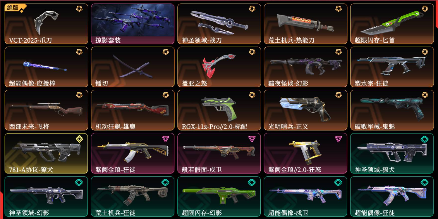 恶意维权秒拉黑,请勿逃跑挂机,请做有素质的好公民 已在公安备案,开挂毁号必追究,一切费用毁号者承担 刑法故意毁坏罪,处三年以下有期徒刑,拘役或者罚金 网络不是法外之地请大家文明游戏,言行要负法律责任;镭切,VCT 2025 爪刀,掠影 戍卫,掠影 狂徒,紫阙金琅 狂徒,塑水宗 狂徒,西部未来 飞将,