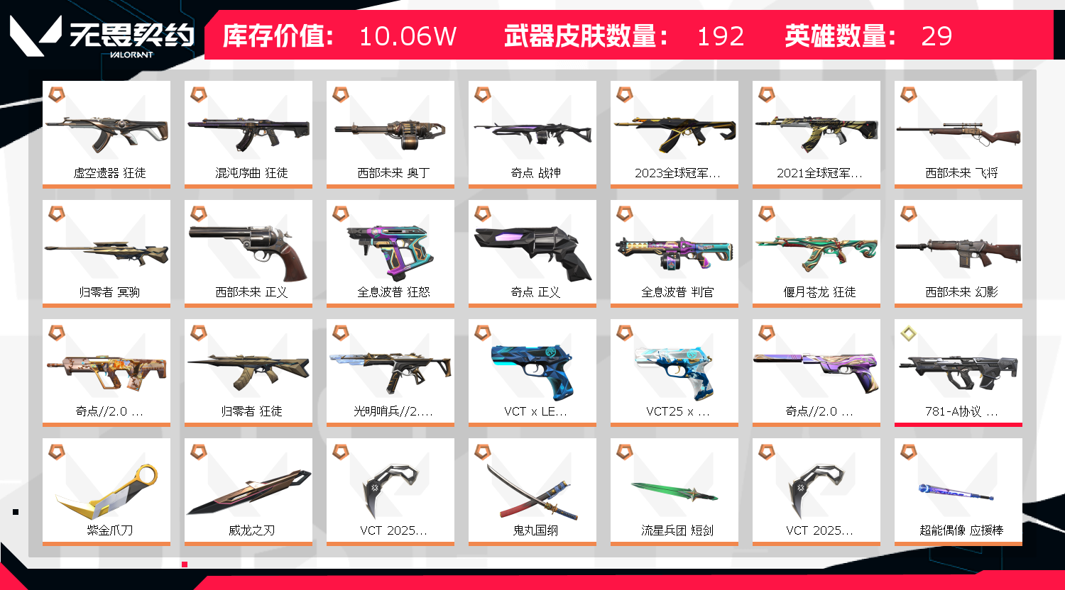 允许 英雄28 武器皮肤数量191;西部未来 奥丁,奇点 战神,紫金爪刀,威龙之刃,VCT 2025 爪刀,起源 雄鹿,天界神兵//2.0 幻影,