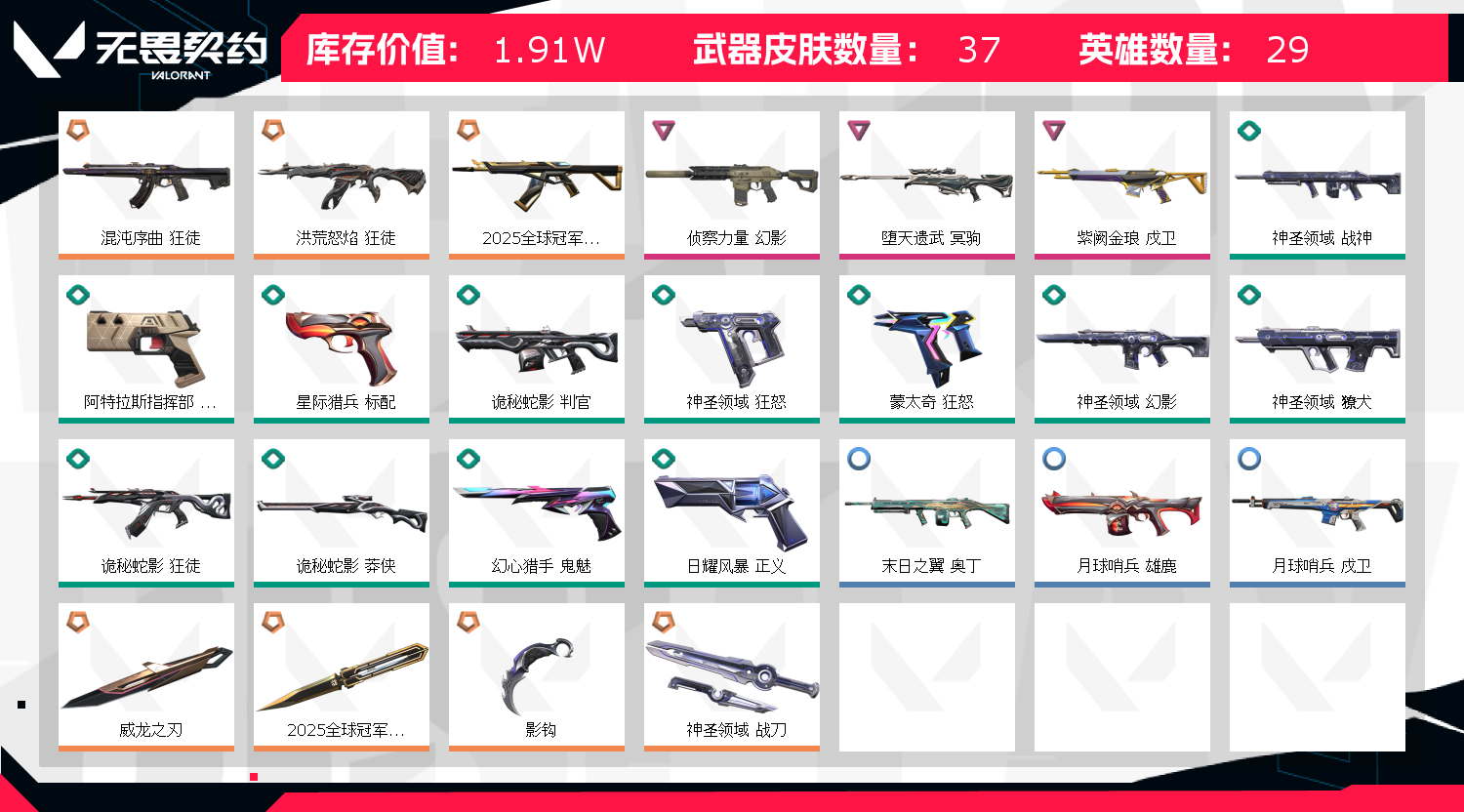 首页 > 租号大厅 > 无畏契约-wegame > wegame/wegame > 25冠军套装✨影钩✨威龙之刃✨混沌 流脓狂徒✨侦察幻影✨紫金戍卫✨弃王冥驹