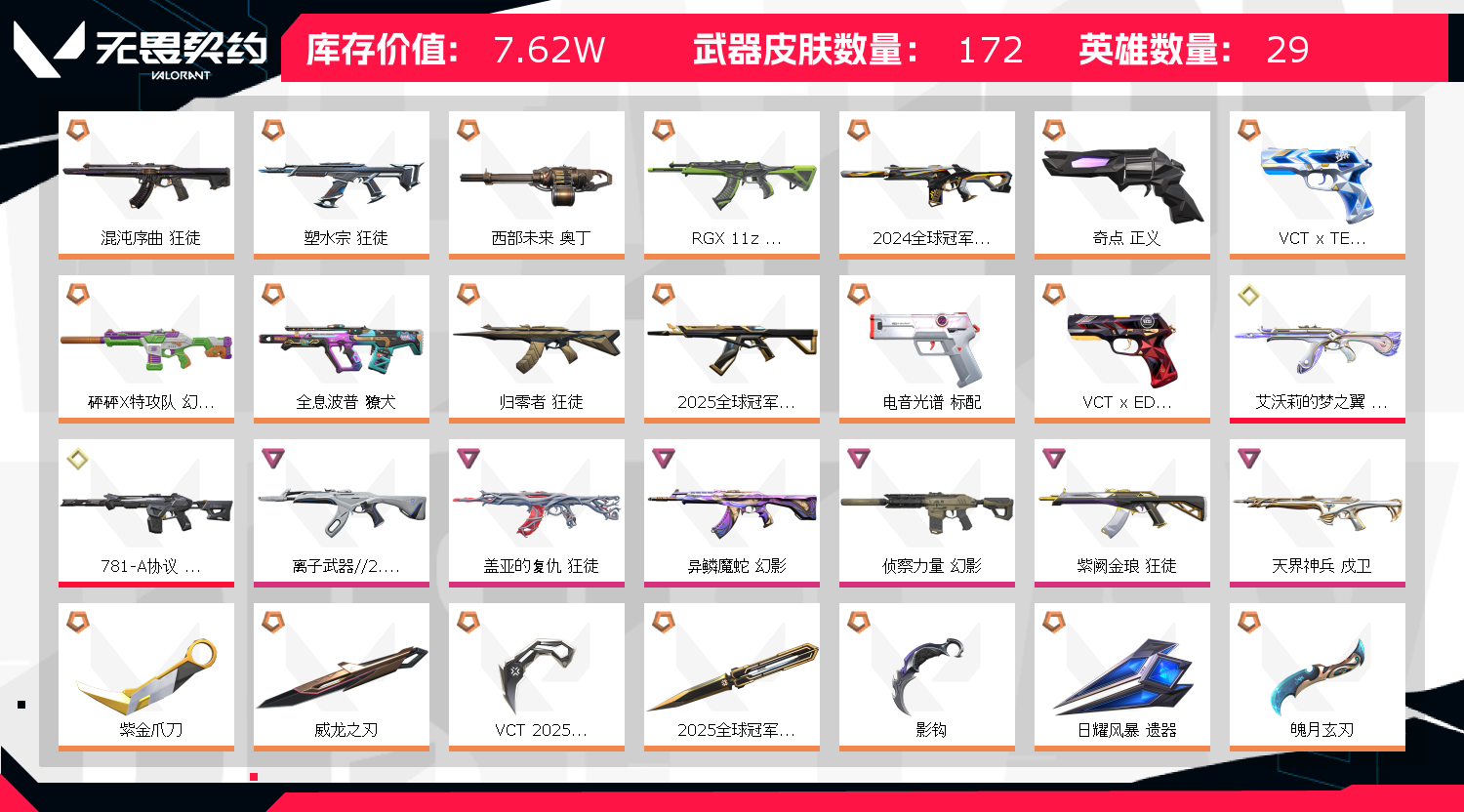 ⭐冻结请点击协助,会自动解冻,等几分钟重新登入即可⭐ 请勿挂机,严🈲游戏中挂机拉黑!!! 账号R点请勿使用,本店铺及时补充新套装,若使用R点无法升级新套装,攒R点辛苦,望谅解! 老板不要杀太多,现在风控的严重,杀多了会临时冻结,到时候我可能不在无法解冻!使用外挂脚本导致游戏账号封禁直接向平台提取ip地址! 本账号经过网络财产备案,一经发现直接报警处理立案追责,根据账号价值全额赔偿感谢支持谢谢合作谢谢合作!!!!禁止利用账号进行开挂、使用辅助违规软件诈骗等违规操作!;西部未来 奥丁,紫金爪刀,威龙之刃,VCT 2025 爪刀,盖亚的复仇 狂徒,异鳞魔蛇 幻影,侦察力量 幻影,
