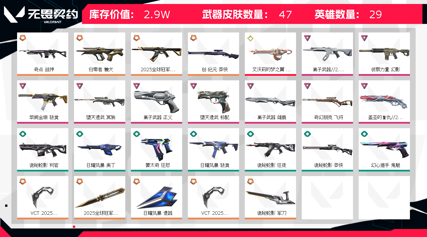 可排全英雄25冠军ak/离子ak/威龙ak/侦查m4/vct和25冠军蝴蝶刀/离子正义/猫奥丁/奇点战神/离子雄鹿盖亚短喷/紫金骇灵/朋克飞将/堕天大狙/堕天标配/归零獠犬;艾沃莉的梦之翼 奥丁,奇点 战神,VCT 2025 爪刀,归零者 獠犬,侦察力量 幻影,离子武器//2.0 狂徒,紫阙金琅 骇灵,