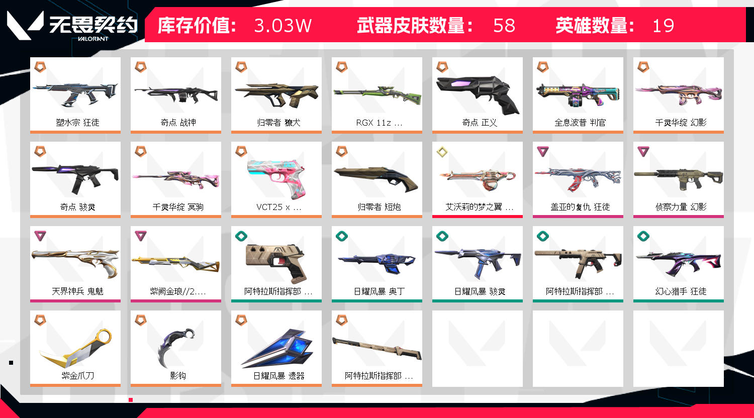 允许 英雄11 武器皮肤数量47 盖亚宿水ak 奇点正义骇灵战神 紫金喷刀 显卡莽侠 莲花大狙 归零獠犬 天界鬼魅 vct标配 猫猫奥丁 掠夺刀 侦查幻影;艾沃莉的梦之翼 奥丁,奇点 战神,紫金爪刀,归零者 獠犬,盖亚的复仇 狂徒,侦察力量 幻影,塑水宗 狂徒,