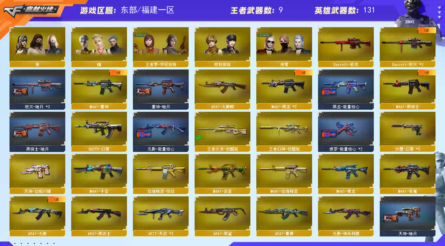 【重要套装】幻兽套装/夜魔套装/雷暴套装 【英雄武器】王者幻神-觉醒版/Barrett-毁灭(3)/Barrett-极光/AWM-天龙/AWM-裁决/王者之决-觉醒版/M4A1-青龙/M4A1-雷神/M4A1-死神/M4A1-黑龙(2)/M4A1-龙血/M4A1-千变/M4A1-黑骑士/M4A1-武圣/M4A1-夜魔/M4A1-玫瑰精灵/王者之魄-觉醒版(2)/王者之势-觉醒版/QBZ95-幻兽/AK12-天启(3)/AK47-火麒麟/王者炎心-觉醒版/AK47-无影/无影-神兵利器/AK47-雷暴/AK47-黑鲨/AK47-黑武士/AN94-超新星/烈火-动感闪耀/9A91-烈火/RPK-盘龙(6)/汤姆逊-烈龙(6)/AA-12-雷霆/加特林-炼狱/王者之灵-觉醒版/天神-动感闪耀/沙鹰-天神(2)/沙鹰-修罗(6)/沙鹰-幻兽(3)/Glock18-武圣/破空枪刃-夜魔/USP-雷暴(2)/麒麟刺(2)/龙啸(2)/王者之啸-觉醒版/擎天(2)/屠龙-动感闪耀/屠龙(4)/马来剑-夜魔/女皇利刃-幻兽;USP-雷暴,炽芒蝶刃,RPK-盘龙,