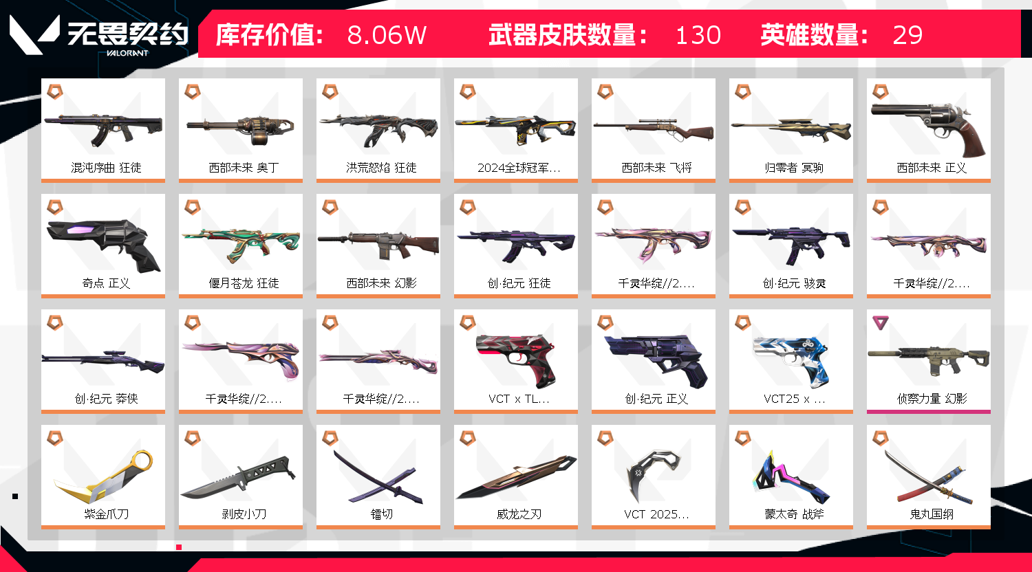 郑重声明:若出现 账号封禁/毁号等情况,本人商户多年,所属账号已在派出所备案,经过网络财产备案价值! 使用外挂脚本导致游戏账号封禁直接向平台提取ip地址!一经发现直接报警处理立案追责,根据账号价值追究其法律责任! 请租客文明游戏,不要开挂或挂机!切勿心存侥幸!因无畏契约检测严格,为防止后台插件导致封号,上号前请务必重启电脑! 注意事项:出现冻结,我们看到后会及时解冻。等5-10分钟重新登陆即可 1.登陆界面稍等2分钟会上去(自动登录)老板不要着急,一次不行多来几次wegame界面要耐心等2分钟 2.密令会自动输入如果一次不成功多来几次。 3..进入wegame后到弹短信验证处,关闭掉,重新下载无畏契约这个游戏即可成功上号,记住。这个方法百分百上号成功!就是进入wegame重新下载无畏契约游戏 !!!百分百成功!! 4.请及时续租不要挂机,到时不下线,但是下一个会挤号导致挂机,所以请及时续租,导致禁赛的一律拉黑 。 5.祝老板玩的愉快,喜欢可以收藏关注;西部未来 奥丁,紫金爪刀,剥皮小刀,镭切,威龙之刃,VCT 2025 爪刀,洪荒怒焰 狂徒,