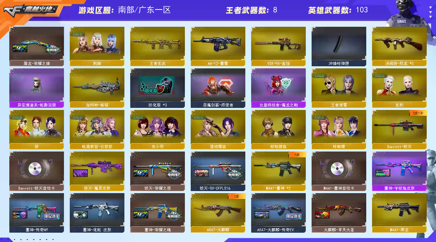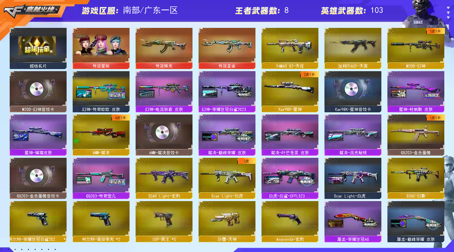 《传说星骇》《传说辉光》《传说圣谕》《幻神+荣耀世冠白鲨2023+电流骇客+传奇欧欧+音效卡》《星神+枪娘默+璀璨+音效卡》《M200竞技荣光》《VSK金蚀》《王者风神 毁灭 裁决》《白虎》《G36C幻影》《天戎》《qbz金色蔷薇 烈火 王者凌虎 千变 火麒麟 黑龙 雷神 黑骑士》《柯尔特竞技荣光 usp冥王 柯尔特荣耀世冠白鲨2023》《竞技荣光套装》《四防电竞教官云悠悠 关小雨 荆棘 枪娘樱 玄豹 四防研 零纪元 四防王者凌霄》《毁灭音效卡 雷神音效卡 金色蔷薇音效卡 裁决音效卡》《毁灭魔灵 qbz传奇宠儿 白虎白鲨23冠军 裁决巅峰荣耀 雷神传奇N9 毁灭荣耀之怒 雷神荣耀之魄 火麒麟CFSTAR》;柯尔特-荣耀世冠白鲨2023,传说星骇,电竞教官-云悠悠,QBZ03-金色蔷薇,G36C-幻影,M200-幻神,Scar Light-白虎,