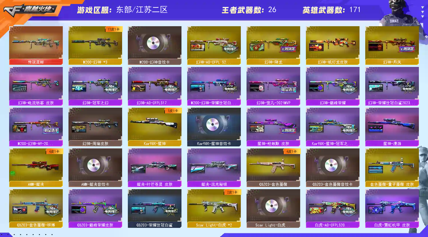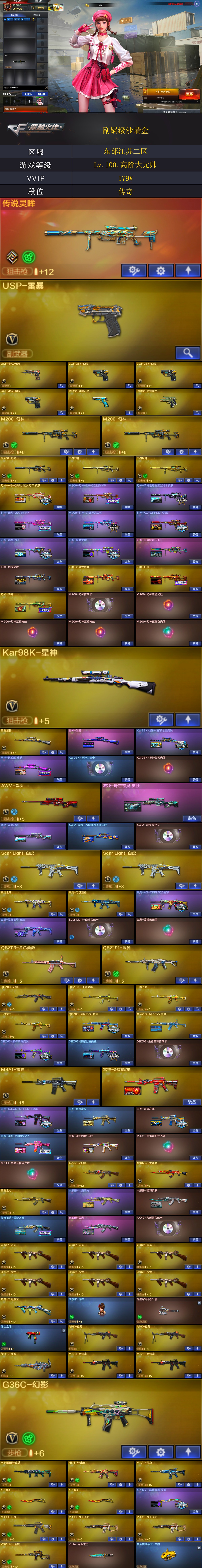 【商品标题】:东部江苏二区-179V-可二次实名-【Lv.100.高阶大元帅】-【段位:传奇】 【稀有武器】:传说灵眸/M200-幻神(3)/Kar98K-星神/VSK-94-金蚀/G36C-幻影/ScarLight-白虎(2)/M14EBR-玄武/M4A1-青龙/HK417-朱雀/QBZ03-天罚/M4A1-幻灵/M4A1-神工天巧(2)/USP-雷暴/柯尔特-电竞装甲/COP357-幻灵(3)/USP-神工天巧/天神-动感闪耀/柯尔特-冠军之特/QBZ03-金色蔷薇/AK47-火麒麟(3)/M4A1-黑龙/M4A1-雷神(5)/M4A1-黑骑士(2)/AK47-无影/AK47-黑武士/荣耀世冠-火麒麟/白虎-电玩蓝兔/Barrett-毁灭(4)/Barrett-极光/AWM-裁决/RPK-盘龙(2)/加特林-炼狱/汤姆逊-烈龙(6)/AA-12-雷霆(2)/炽芒蝶刃(2)/斩神刀-雷暴/马来剑-夜魔/幻灵之锋/擎天-竞技荣光/唐刀-神工天巧 【王者武器】:王者之心-觉醒版/QBZ-03-王者蔷薇-觉醒版/白虎之魄-觉醒版/王者芳薇-觉醒版(2)/王者幻神-觉醒版/王者星神-觉醒版/王者风神-觉醒版 【热门角色】:机械姬/兰-巾帼英雄/晴雅/雾萌萌/鹰/影豹/隼/乔伊教练/蛇隐宗/王者春/王者玲珑/王者潘多拉/王者炫/灵狐者-职业经理/女主播/潘多拉-X/幽/职业选手 【热门音效卡】:M200-幻神音效卡/Kar98K-星神音效卡/AWM-裁决音效卡/Scar Light-白虎音效卡/QBZ03-金色蔷薇音效卡/HK417-朱雀音效卡/Barrett-毁灭音效卡/M4A1-黑骑士音效卡/AK47-火麒麟音效卡/M4A1-黑龙音效卡/Barrett-极光音效卡(2) 【热门皮肤】:幻神-AG-CFPLS24冠军皮肤/M200-幻神-N9-2022MVP/幻神-荣耀世冠白鲨2023皮肤/幻神-宠儿-2021MVP/M200-幻神-荣耀世冠白鲨/幻神-AG-CFPLS17冠军/幻神-冠军之幻/幻神-巅峰荣耀/幻神-电流骇客皮肤/幻神-周瑜皮肤/幻神-纸灯龙皮肤/幻神-丹凤/幻神-降龙/擎天-傲竹金蛇皮肤/金色蔷薇-量子蔷薇皮肤/HK417-朱雀-武当/星神-漫游/火麒麟-白虎/屠龙-星火燎原/QBZ03-巅峰荣耀皮肤/Kar98K-星神-冠军之星皮肤/雷神-R.LGD-CFPLS18冠军/擎天-冠军之击/星神-枪娘默 皮肤/白虎-霓虹机甲 皮肤/裁决-流光秘银/白虎-AG-CFPLS20冠军/火麒麟-大唐荣光/毁灭-直播专属/屠龙-巅峰荣耀皮肤/传奇石头-横秒之巅/毁灭-BEAN-2020MVP/QBZ03-荣耀世冠白鲨/M4A1-战神赵云/黑骑士-战神马超/雷神-宠儿-2019MVP/黑骑士-AG-S4冠军典藏/屠龙-荣耀之锋/毁灭-荣耀之怒/龙啸-冠军之啸/雷神-荣耀之魄 【其他亮点】:斯泰尔-蝴蝶/Knife-冠军之刃/异变清道夫/贝雷塔687-射手座/黄金猫猫手套-白鲨/金刚伞-电玩红兔/烟雾弹-荣耀世冠白鲨2023 (截图展示段位不代表实际段位,如赛季更新等不可抗拒因素发生变化,其余道具看截图或咨询客服);USP-雷暴,柯尔特-冠军之特,炽芒蝶刃,Knife-冠军之刃,隼,晴雅,RPK-盘龙,