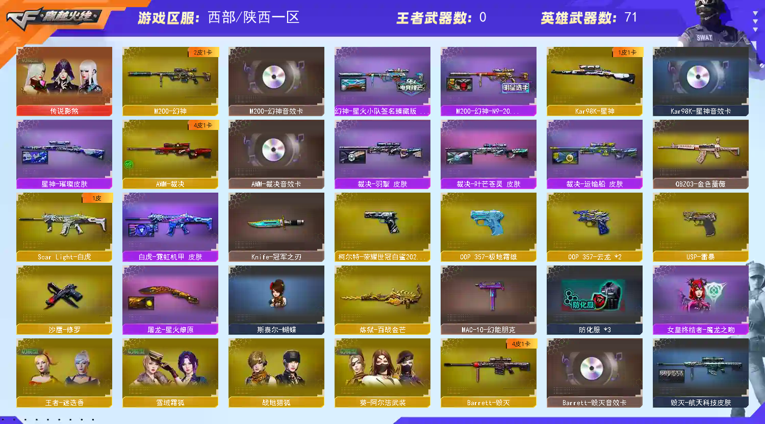 【西部】爆破天花板♥影煞幻神星火三件套♥星神璀璨带卡♥裁决三件套♥白虎qbz带皮♥满质量手枪;USP-雷暴,柯尔特-荣耀世冠白鲨2023,Knife-冠军之刃,传说影煞,QBZ03-金色蔷薇,M200-幻神,Scar Light-白虎,
