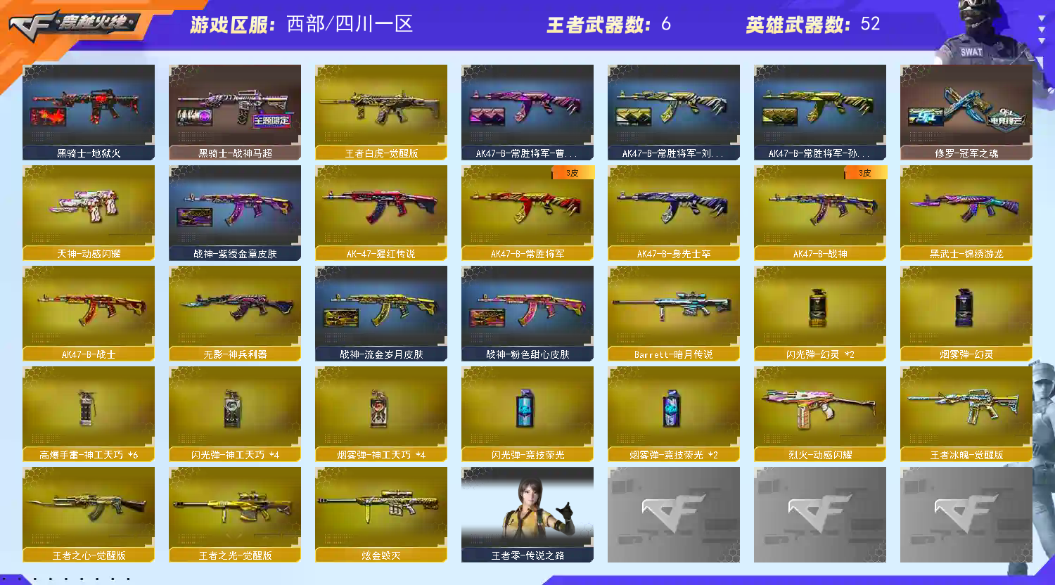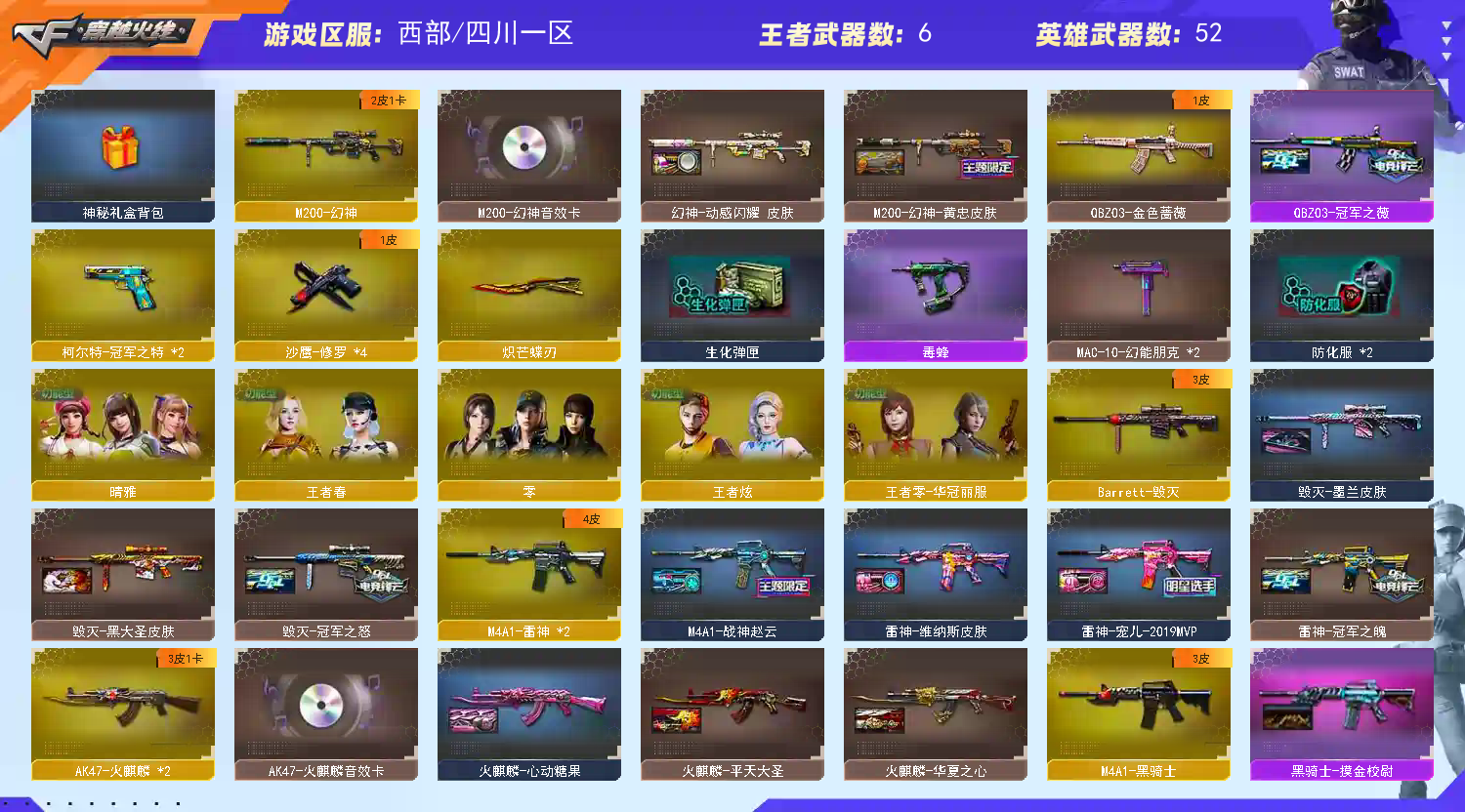 装备信息: 王者武器:炫金毁灭;王者之光-觉醒版;王者之击-觉醒版;王者之啸-觉醒版;王者之心-觉醒版;王者冰魄-觉醒版;王者白虎-觉醒版 英雄武器:M4A1-黑骑士;AK47-火麒麟;Barrett-毁灭;沙鹰-修罗;M4A1-雷神;M200-幻神;幻灵之锋;柯尔特-冠军之特;烟雾弹-竞技荣光;闪光弹-竞技荣光;炽芒蝶刃;高爆手雷-神工天巧;闪光弹-神工天巧;唐刀-神工天巧;AK-47-猩红传说;无影-神兵利器;烟雾弹-神工天巧;Barrett-暗月传说;QBZ03-金色蔷薇;烈火-动感闪耀;手雷-动感闪耀;天神-动感闪耀;屠龙-动感闪耀;黑武士-锦绣游龙;AK47-B-常胜将军;AK47-B-身先士卒;烟雾弹-幻灵;闪光弹-幻灵;龙啸-烈火龙威;AK47-B-战神;AK47-B-战士 装饰品:泰迪娃娃;毁灭-冠军之怒;雷神-宠儿-2019MVP;M4A1-战神赵云;火麒麟-平天大圣;火麒麟-心动糖果;火麒麟-华夏之心;黑骑士-摸金校尉;关羽玩偶;火麒麟玩偶;QBZ03-冠军之薇;战神-粉色甜心皮肤;战神-流金岁月皮肤;战神-紫绶金章皮肤;AK47-B-常胜将军-曹操;AK47-B-常胜将军-刘备;小兔姬玩偶;AK47-B-常胜将军-孙权;;麒麟刺-萌杀皮肤;毁灭-黑大圣皮肤;雷神-维纳斯皮肤;雷神-冠军之魄;魅影玩偶;CFS 击杀图标;绝迹语音包;黑骑士-地狱火;零-水下丽影玩偶;黑骑士-战神马超;修罗-冠军之魂;蝴蝶玩偶;M200-幻神-黄忠皮肤 角色:金戈;零;堕天使;复仇者;嘉年华灵狐;潘多拉-锋芒精英;木兰;游珑儿;雪莉杨-摸金校尉;救世复仇;灵狐者-黄金海岸;晴雅;王者零-华冠丽服;圣诞潘多拉-X;剑齿虎-X;风暴女;精英部队;猎狐者-X;斯沃特精英;娟娟;紫霞;斯沃特-锋芒精英;剑齿虎;麻雀;维纳斯;兔囡囡;曼陀罗-礼服;超能特工;暗夜-X;青霞仙子;职业选手;王者炫;妲己;蜀雪;葵-赛博朋克 道具:(王者之心金色光效);(M4A1-雷神蓝粉色光效);超级背包;炫彩背包;烟雾保护头盔;闪光护目镜;防弹衣;防弹头盔;手雷包;C4工具钳;防化服;夺命之镰;疯狂宝贝;生化弹匣;步枪弹匣;AK47-火麒麟音效卡;M200-幻神音效卡;小萝莉;天使之翼;绿色巨人;黄金头骨护目镜;天使光环;超级护目镜 幻神武器:M200-幻神;柯尔特-冠军之特,炽芒蝶刃,晴雅,QBZ03-金色蔷薇,M200-幻神,