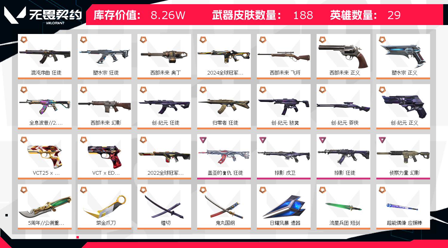 22冠军套,苍龙之刃,西部套,创纪元套,假面2.0套,掠夺套,离子套,显卡蝴蝶,显卡爪刀,紫金爪刀,堕天大狙24、25EDG标配,ak(盖亚,归零者,塑水宗,全息波普,耀鳞威龙),幻影(24冠军,22冠军,侦查)塑水宗正义,天界神兵鬼魅,;西部未来 奥丁,5周年//公测重制版 苍龙之刃,紫金爪刀,镭切,盖亚的复仇 狂徒,掠影 戍卫,掠影 狂徒,