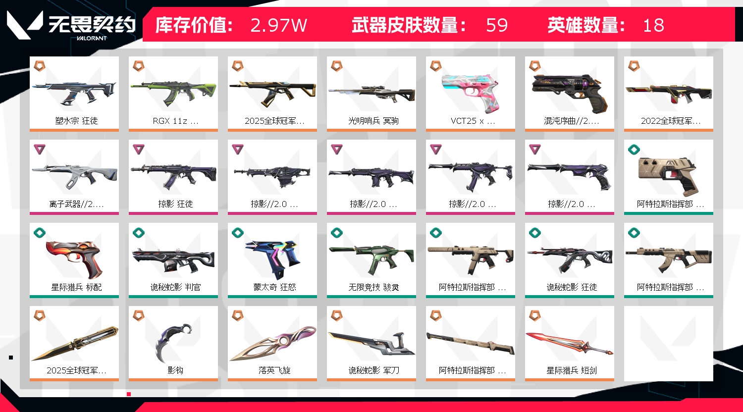 冻结三分钟内解除,短信通知重新上即可!喜欢收藏不迷路、游戏异常进小黑屋、时间不够请提前续租或者不要开局 【套装】:2025全球冠军赛套装,掠影//2.0套装 【英雄】:幻棱,炼狱,暮蝶,壹决,捷风,雷兹,不死鸟,贤者,猎枭,芮娜,奇乐,尚勃勒,霓虹,星礈,盖可 【近战武器】:近战武器-2025全球冠军赛 蝴蝶刀,近战武器-影钩,近战武器-落英飞旋,近战武器-诡秘蛇影 军刀,近战武器-阿特拉斯指挥部 甩棍,近战武器-星际猎兵 短剑 【狂徒】:狂徒-2025全球冠军赛,狂徒-塑水宗,狂徒-RGX 11z Pro,狂徒-掠影,狂徒-离子武器//2.0,狂徒-诡秘蛇影 【幻影】:幻影-2022全球冠军赛,幻影-掠影//2.0,幻影-末日之翼 【戍卫】:戍卫-折光棱晶 【冥驹】:冥驹-光明哨兵 【飞将】:飞将-末日之翼 【莽侠】:莽侠-诡秘蛇影 【奥丁】:奥丁-掠影//2.0,奥丁-末日之翼 【判官】:判官-诡秘蛇影 【骇灵】:骇灵-掠影//2.0,骇灵-无限竞技 【蜂刺】:蜂刺-折光棱晶 【标配】:标配-折光棱晶 【VCT手枪】:标配-VCT25 x BLG 【正义】:正义-混沌序曲//2.0,正义-游戏结束 【鬼魅】:鬼魅-掠影//2.0,鬼魅-诡秘蛇影 【短炮】:短炮-末日之翼 【卡面】:无畏契约:暮蝶 卡面,悠享食光 卡面,热舞环节 卡面,铁之华 卡面,树懒大作战 卡面,红鳞松叶 卡面,趁热吃 卡面,无畏契约GO!一卷:芮娜 卡面,无畏契约GO!一卷:零 卡面,《双城之战》金克丝 卡面,逆向独行 卡面 ,代号红色 卡面,新兵报到 卡面,V契约 卡面,无畏契约 卡面 【喷漆】:伤心心 喷漆,霓光四射 喷漆,买装还是存钱 喷漆,关门放狗 喷漆,无畏契约GO!一卷:零 喷漆,暴走萝莉 喷漆,松叶 喷漆,又一个梦幻组合 喷漆,胜利属于无畏契约 喷漆,GLHF 喷漆,无畏契约 喷漆 【挂饰】:无畏契约GO!一卷 零 挂饰,天外飞客 挂饰,《双城之战》魄罗 挂饰,无畏契约 纪念币 挂饰;掠影 狂徒,RGX 11z Pro 狂徒,塑水宗 狂徒,离子武器//2.0 狂徒,
