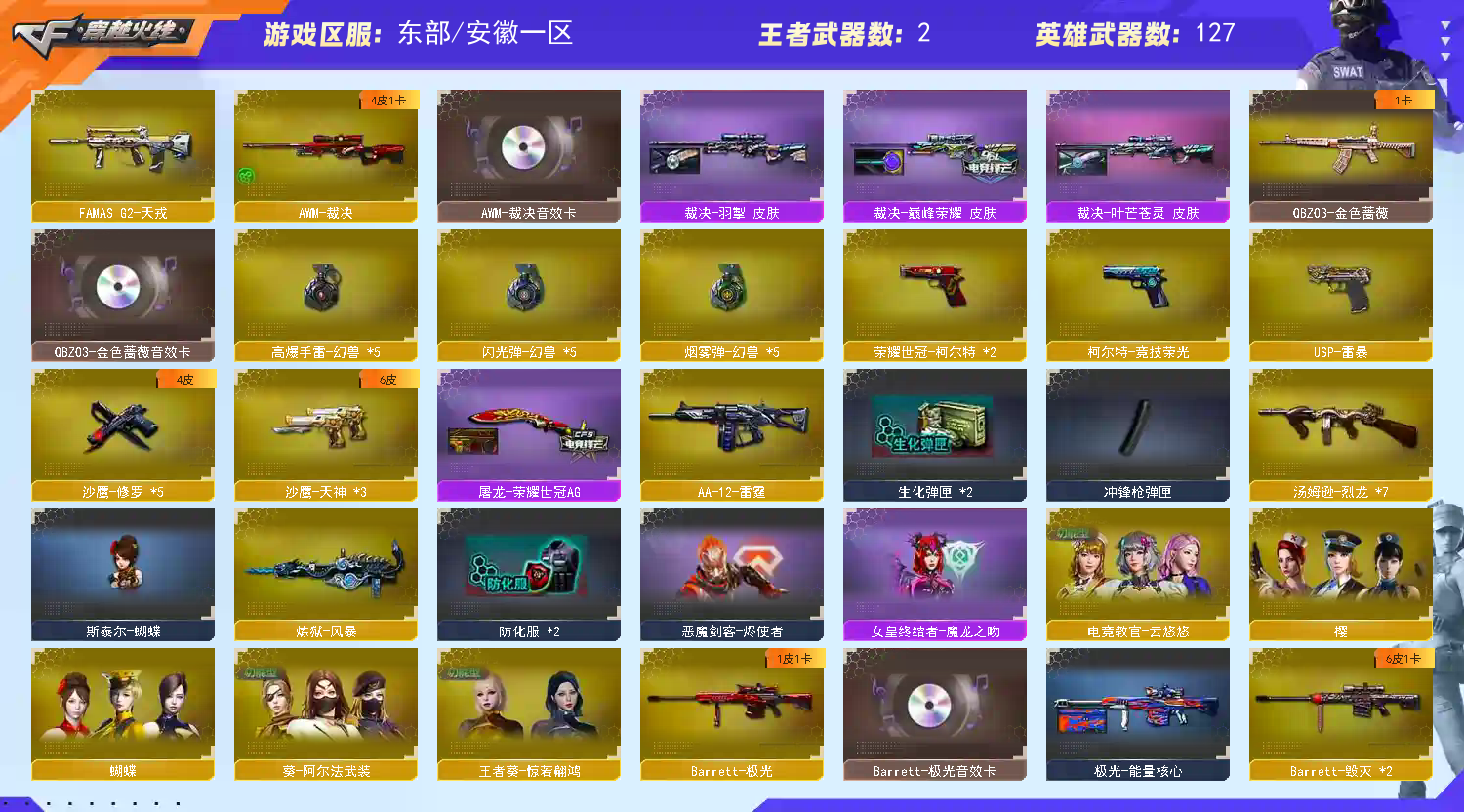 幻兽X5/裁决3皮肤+裁决音效卡/M200-竞技荣光/斯泰尔-蝴蝶/死亡之眼/荣耀世冠-柯尔特(2)/荣耀世冠-龙啸/USP-雷暴/金色小号/C.A.T/沙鹰-修罗(5)/M4A1-黑骑士/汤姆逊-烈龙(7)/白虎-电玩蓝兔/QBZ03-金色蔷薇/高爆手雷-幻兽(5)/M4A1-千变/AK47-火麒麟(2)/M4A1-黑龙(2)/M4A1-雷神/M4A1-黑骑士/AK47-无影/M4A1-死神/AK12-天启/AN94-超新星/M4A1-武圣/AK47-机械迷城/AK47-黑鲨/无影-神兵利器/FAMASG2-天戎/QBZ95-幻兽/QBZ03-金色蔷薇/王者之魄-觉醒版/AK47-B-战神/王者之烈-觉醒版/白虎-电玩蓝兔/AWM-天龙/Barrett-毁灭(2)/Barrett-极光/AWM-裁决/M200-竞技荣光/Barrett-金色蔷薇/炼狱-风暴/汤姆逊-烈龙(7)/AA-12-雷霆/沙鹰-修罗(5)/沙鹰-天神(3)/USP-雷暴/荣耀世冠-柯尔特(2)/柯尔特-竞技荣光/破空枪刃/沙鹰-幻兽(5)/Glock18-武圣/屠龙(3)/龙啸/马来剑-夜魔/擎天/麒麟刺/擎天-竞技荣光(2)/荣耀世冠-龙啸/斩神刀-雷暴/女皇利刃-幻兽/麒麟刺-百战金芒/高爆手雷-雷霆/高爆手雷-幻兽(5)/高爆手雷-雷暴/高爆手雷-夜魔/高爆手雷-竞技荣光(10)/闪光弹-雷霆/闪光弹-幻兽(5)/闪光弹-雷暴/闪光弹-夜魔/闪光弹-竞技荣光(10)/烟雾弹-雷霆/烟雾弹-幻兽(5)/烟雾弹-雷暴/烟雾弹-夜魔/烟雾弹-竞技荣光(10)/M4A1-赤狱骑士/魂·雷神-神秘按键/御·黑骑士·哪吒闹海/源·武圣/源-金色蔷薇/魂·9A91·烈火-电子连击/魂·裁决-凤灵/魂·裁决-羽掣/魂·毁灭-秦师/魂·Barrett-朱雀-锦鲤/灵·Barrett-朱雀-炫光(2)/灵·天神-穹宇/源·武圣glock/灵·麒麟刺-穹宇/天龙-曼陀罗/火麒麟-灵狐/斯泰尔-蝴蝶/AWM-灵狐-15周年嘉年华/海滩汪汪-巴雷特/M37-葵/COP-旗袍/C.A.T/迷你深渊冰龙/迷你裂空之翼/迷你波特博士/夺魂/生化手雷-机甲核心/深渊终结者手雷/闪光弹-小乔/迷你超能女侍/死亡之眼/超级对讲机/致命乱世-超越Max/神圣爆裂者III/AK47-冰龙粉碎者/冰龙粉碎者-白马银枪/激光毁灭者III-白马银枪(2)/VEPR-12-金魔/激光毁灭者III(3)/机甲撕裂者III/试炼破坏者III/阐释者III/樱/蝴蝶/电竞教官-云悠悠/王者葵-惊若翩鸿/修道士/暗夜-X/初恋灵狐/芳心审判者/嘉年华灵狐/娟娟/零-水下丽影/灵狐者-X/灵狐者-黄金海岸/灵狐者-七夕宝贝/灵狐者-职业经理/龙儿-小淘气/麻雀/曼陀罗-礼服/萌儿/潘多拉-X/潘多拉-甜心教官/青霞仙子/斯沃特-X/兔囡囡/铁骑荣耀/新娜塔莎/雪莉杨-摸金校尉/影武者-X/AG战队炫彩背包/亚洲杯纪念炫彩背包/炫彩背包/背包-洛丽塔/背包-葫芦兄弟/裂空之翼背包-金色/超级背包(2)/女皇终结者-魔龙之吻/救世主-黑桃战神/绿色巨人/灵魂忍者/变异宝贝/迷雾幽灵(2)/生化弹匣/夺命之镰/防化服(2)/金色流光-枪王排位/星辰流光-枪王排位/枪王排位28赛季金色流光/枪王排位29赛季金色流光/语音特效-机器人/语音特效-生化/电玩兔兔表情/防弹头盔(7)/防弹衣(6)/C4工具钳(6)/手雷包(5)/AK47-火麒麟音效卡/M4A1-雷神音效卡/M4A1-黑龙音效卡/M4A1-黑骑士音效卡/Barrett-毁灭音效卡/Barrett-极光音效卡/QBZ03-金色蔷薇音效卡/AWM-裁决音效卡/裁决-巅峰荣耀皮肤/裁决-羽掣皮肤/裁决-叶芒苍灵皮肤/雷神-能量核心/雷神-星空/火麒麟-AG战队皮肤/火麒麟-荣耀世冠AG/火麒麟-百城/火麒麟-心动糖果/毁灭-暗月/毁灭-星空/毁灭-黑大圣皮肤(2)/毁灭-风暴/毁灭-魔灵皮肤/M4A1-千变-孔明皮肤/黑龙-能量核心/黑龙-暗月/黑骑士-暗月(4)/无影-暗月(5)/无影-能量核心/无影耀金皮肤/死神-秘银(4)/天启-暗月(7)/战神-粉色甜心皮肤/战神-紫绶金章皮肤/战神-流金岁月皮肤(3)/天龙-秘银/天龙-能量核心/AWM-天龙-传奇70KG/AWM-天龙-传奇白鲨/极光-能量核心/修罗-能量核心(3)/修罗-星空/天神-暗月(6)/屠龙-荣耀世冠AG/轻型军用手斧-再燃火线/擎天-秘银/麒麟刺-萌杀皮肤;