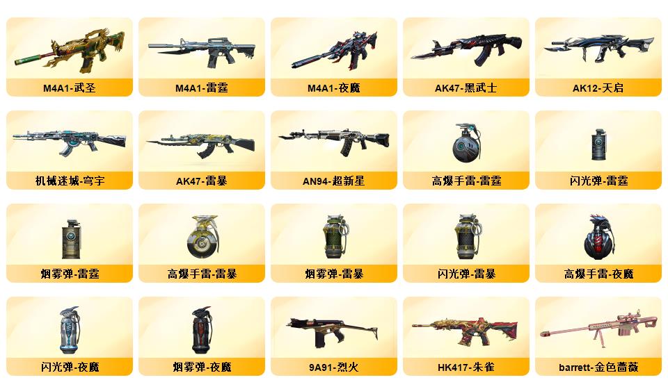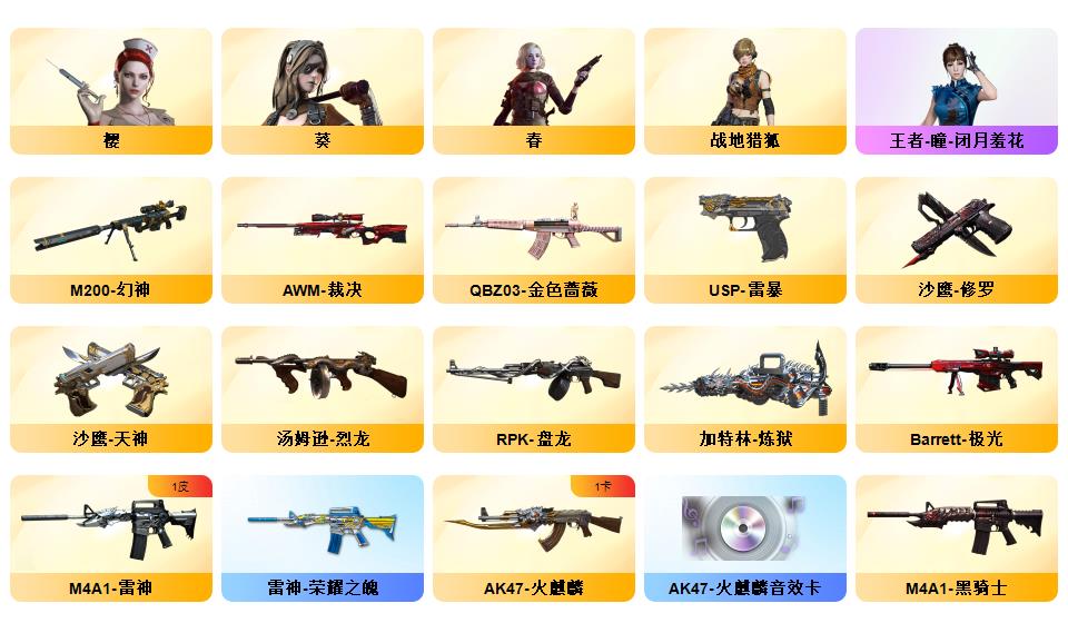 【6烈龙+蝴蝶/8盘龙】【M200-幻神,死亡之眼】95V QBZ03-金色蔷薇,HK417-朱雀,M4A1-黑骑士*2,加特林-炼狱,斯泰尔-蝴蝶,USP-雷暴,沙鹰-修罗*3 【王者炫金武器】:炫金天龙 【音效卡】:AK47-火麒麟音效卡,Barrett-毁灭音效卡,Barrett-碧霄极光音效卡*2,AWM-昌龙-怀旧音效卡 M200-幻神 HK417-朱雀 Barrett-毁灭