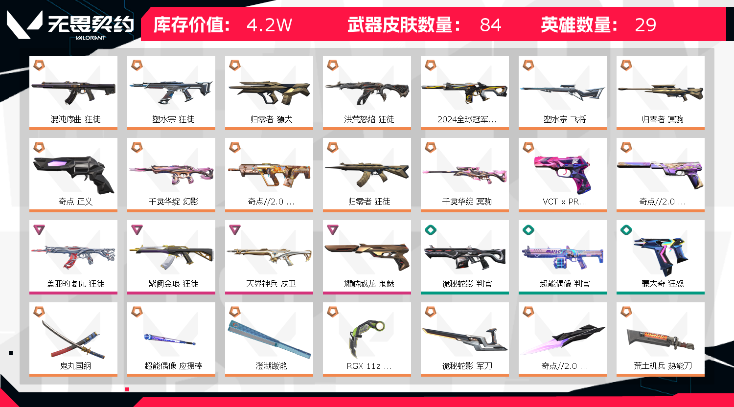 可排位 英雄25 武器皮肤数量83;归零者 獠犬,盖亚的复仇 狂徒,洪荒怒焰 狂徒,紫阙金琅 狂徒,天界神兵 戍卫,混沌序曲 狂徒,塑水宗 狂徒,