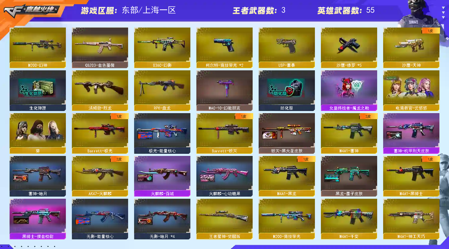 幻神王者星神g36c幻影qbz等等;USP-雷暴,电竞教官-云悠悠,RPK-盘龙,QBZ03-金色蔷薇,G36C-幻影,M200-幻神,