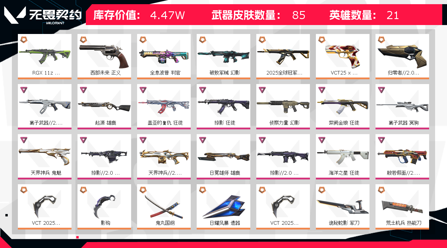 冻结三分钟内解除,短信通知重新上即可!喜欢收藏不迷路、游戏异常进小黑屋、时间不够请提前续租或者不要开局 【套装】:VCT 2025 赛季套装,掠影//2.0套装 【英雄】:幻棱,炼狱,维斯,暮蝶,钛狐,壹决,捷风,雷兹,幽影,不死鸟,贤者,猎枭,零,芮娜,尚勃勒,霓虹,夜露,K/O,盖可 【近战武器】:近战武器-影钩,近战武器-VCT 2025 爪刀,近战武器-鬼丸国纲,近战武器-荒土机兵 热能刀,近战武器-诡秘蛇影 军刀,近战武器-神圣领域 战刀,近战武器-日耀风暴 遗器 【狂徒】:狂徒-2025全球冠军赛,狂徒-RGX 11z Pro,狂徒-掠影,狂徒-盖亚的复仇,狂徒-海洋之星,狂徒-紫阙金琅,狂徒-离子武器//2.0,狂徒-荒土机兵,狂徒-诡秘蛇影 【幻影】:幻影-破败军械,幻影-侦察力量,幻影-掠影//2.0,幻影-神圣领域,幻影-纳击,幻影-末日之翼 【戍卫】:戍卫-逆冲蛮牛,戍卫-月球哨兵,戍卫-折光棱晶 【獠犬】:獠犬-般若假面//2.0,獠犬-神圣领域,獠犬-逆冲蛮牛 【冥驹】:冥驹-掠影,冥驹-离子武器,冥驹-荒土机兵,冥驹-星云暗涌 【飞将】:飞将-末日之翼 【莽侠】:莽侠-诡秘蛇影,莽侠-月球哨兵 【战神】:战神-神圣领域 【奥丁】:奥丁-掠影//2.0,奥丁-纳米打,奥丁-末日之翼 【判官】:判官-全息波普,判官-天界神兵//2.0,判官-诡秘蛇影,判官-纳米击x,判官-炫彩澎湃 【雄鹿】:雄鹿-起源,雄鹿-日冕雄师,雄鹿-逆冲蛮牛,雄鹿-月球哨兵 【骇灵】:骇灵-掠影//2.0,骇灵-荒土机兵,骇灵-无限竞技,骇灵-星云暗涌 【蜂刺】:蜂刺-星云暗涌,蜂刺-折光棱晶 【标配】:标配-荒土机兵,标配-折光棱晶 【VCT手枪】:标配-VCT25 x ED 【正义】:正义-归零者//2.0,正义-西部未来,正义-超限闪存,正义-纳米击,正义-月球哨兵 【鬼魅】:鬼魅-天界神兵,鬼魅-掠影//2.0,鬼魅-诡秘蛇影,鬼魅-星云暗涌 【狂怒】:狂怒-神圣领域,狂怒-逆冲蛮牛 【短炮】:短炮-末日之翼 【卡面】:终章:激斗汉堡 卡面,进入射程 卡面,分崩离析 卡面,纳米击 卡面,抑制技术 卡面,激斗汉堡 卡面,瓦娃雪糕 P2 卡面,从黄昏到黎明 卡面,荒土机兵 卡面,银弹猎手 卡面,逆冲蛮牛 卡面,《双城之战》拥抱 卡面,精灵大战 卡面,欢迎来到底城 卡面,南瓜盛典 卡面,VCT CN首冠 卡面,修车达人 卡面,热舞环节 卡面,正义的化身 卡面,超能偶像 卡面,Clutch 卡面,梦幻奶茶 卡面,源能反应 卡面,纤云弄巧 卡面,无畏契约GO!一卷:芮娜 卡面,深海水族 卡面,清除名单 卡面,无畏契约GO!一卷:零 卡面,《双城之战》金克丝 卡面,同步耍酷 卡面,纪念照 P2 卡面,钢锁vs盖可 卡面,别冒尖 卡面,黑影先生的咖啡! 卡面,代号红色 卡面,新兵报到 卡面,V契约 卡面,无畏契约 卡面,#拯救宽体奇乐 卡面 【喷漆】:小小心意 喷漆,战“素”兔 喷漆,宇宙的指引 喷漆,请求重启 喷漆,逆冲蛮牛 喷漆,纳米击 喷漆,鼻尖上的蝴蝶 喷漆,简笔画黯兽 喷漆,独守蝰腹 喷漆,他们将落荒而逃 喷漆,通缉:战术鹅 喷漆,荒土机兵 喷漆,别挡我吃球! 喷漆,嗨宝南瓜灯 喷漆,嘭! 喷漆,都算到了 喷漆,控场勿近 喷漆,小丑猫 喷漆,熊抱 喷漆,高丽风情小虎 喷漆,梦幻小队 喷漆,霓光四射 喷漆,双人比心 喷漆,买装还是存钱 喷漆,无畏契约GO!一卷:芮娜 喷漆,胜利属于无畏契约 喷漆,GLHF 喷漆,无畏契约 喷漆 【挂饰】:终章:猫猫木乃伊 挂饰,荒土机兵 挂饰,悠闲鸡块 挂饰,猫猫木乃伊 挂饰,水壶 挂饰,纳米击 挂饰,逆冲蛮牛 挂饰,可爱糖糖 挂饰,伞绳 挂饰,《双城之战》小蛋糕 挂饰,第九季//第三幕 纪念币 挂饰,工具腰带 挂饰,熔岩灯 挂饰,第九季//第二幕 纪念币 挂饰,Z世代特饮 挂饰,动力机箱 挂饰,VCT x EDG 挂饰,天外飞客 挂饰,红鳞松叶 挂饰,《双城之战》魄罗 挂饰,插电音乐 挂饰,无畏契约 纪念币 挂饰;VCT 2025 爪刀,起源 雄鹿,盖亚的复仇 狂徒,掠影 狂徒,侦察力量 幻影,紫阙金琅 狂徒,RGX 11z Pro 狂徒,