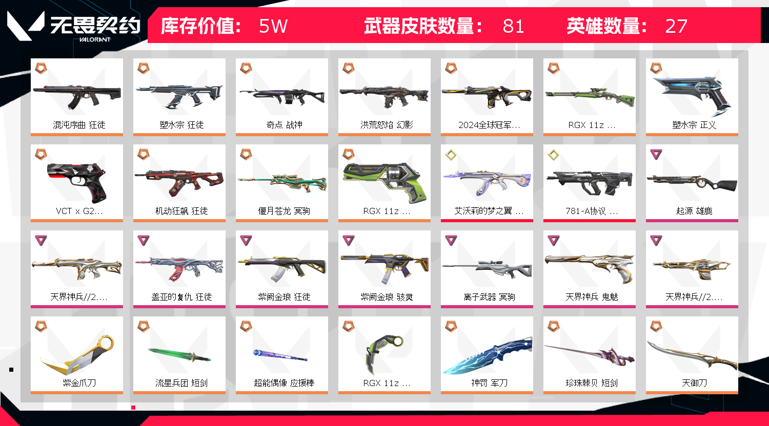 首页 > 租号大厅 > 无畏契约-wegame > wegame/wegame > 5w库存/可排位/79皮肤/全角色/显卡爪刀/天界神兵/盖亚/紫金/混沌/24冠军套装