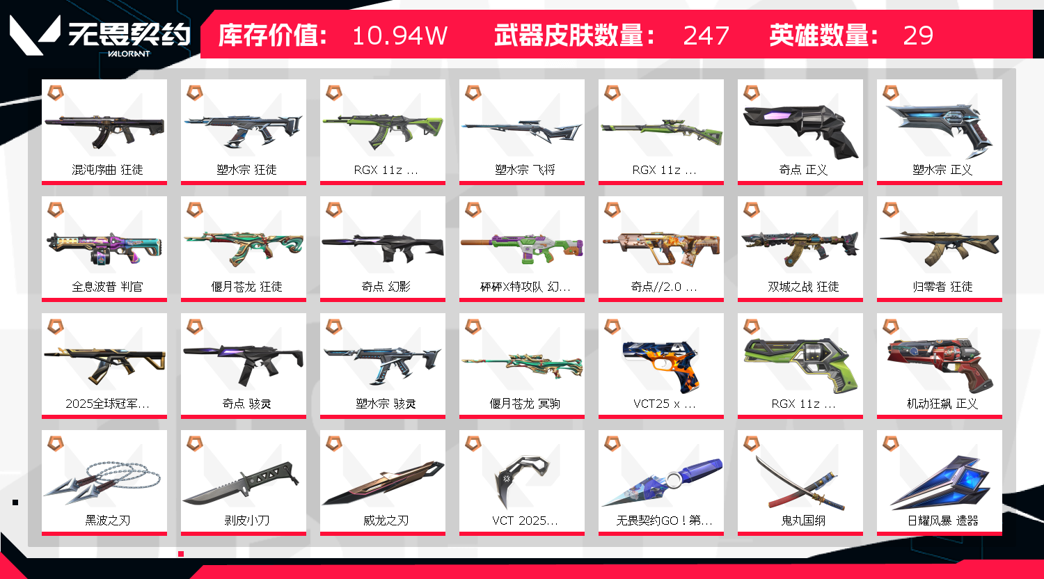 1;黑波之刃,剥皮小刀,威龙之刃,VCT 2025 爪刀,盖亚的复仇 狂徒,掠影 狂徒,侦察力量 幻影,