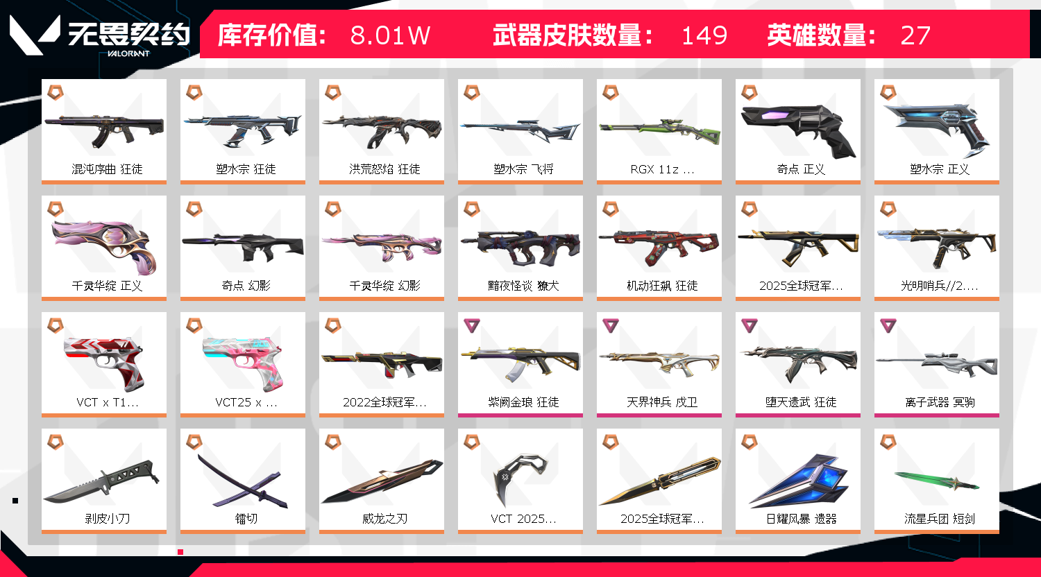 该账号已在法院备案,开挂必究(已成功追回并判罚),禁用r点;剥皮小刀,镭切,威龙之刃,VCT 2025 爪刀,洪荒怒焰 狂徒,紫阙金琅 狂徒,天界神兵 戍卫,