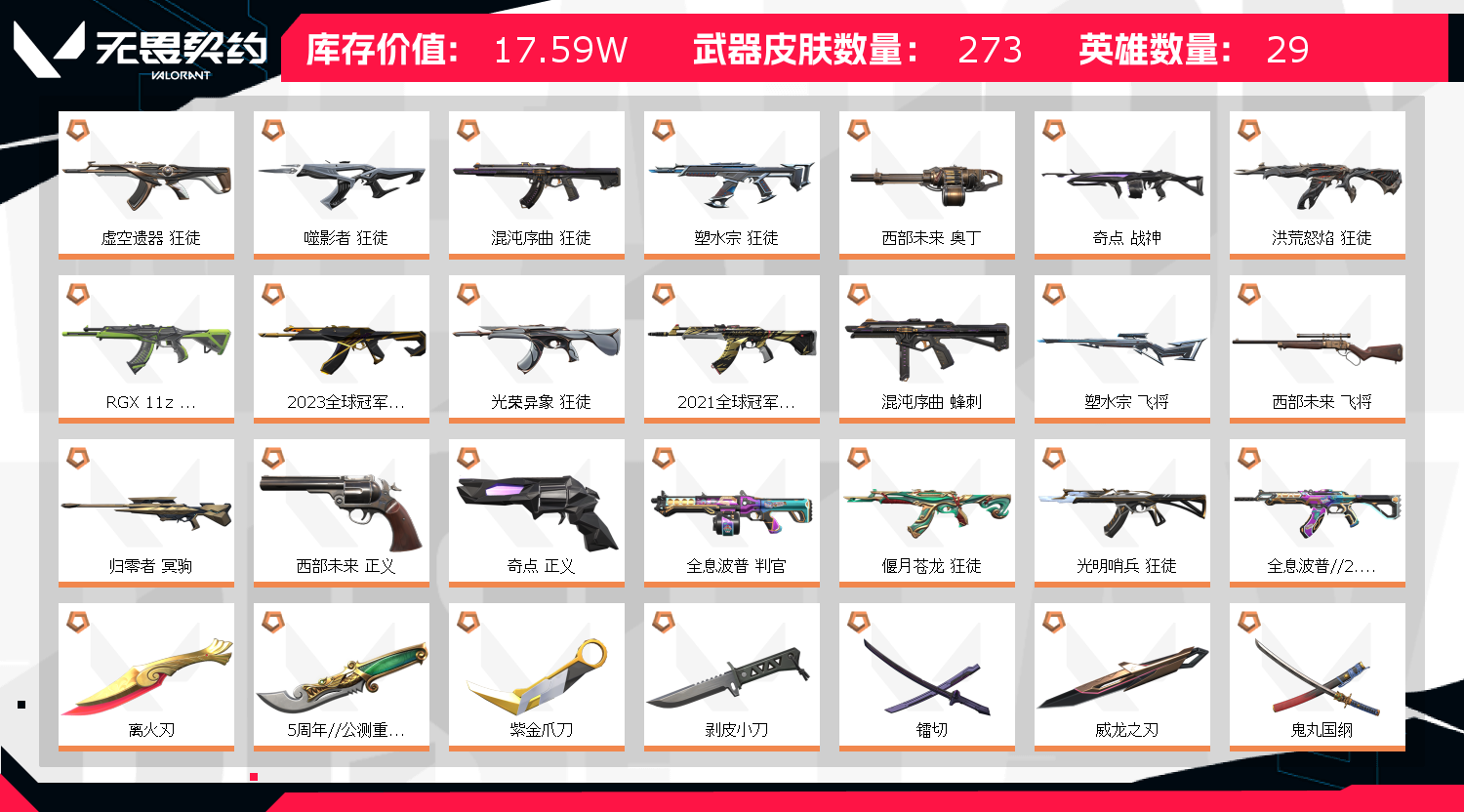 首页 > 租号大厅 > 无畏契约-wegame > wegame/wegame > 17w库存/21狂徒/离火/22套装/23狂徒/25狂徒/爆爆套装/除了新套装其余全套装特效狂徒
