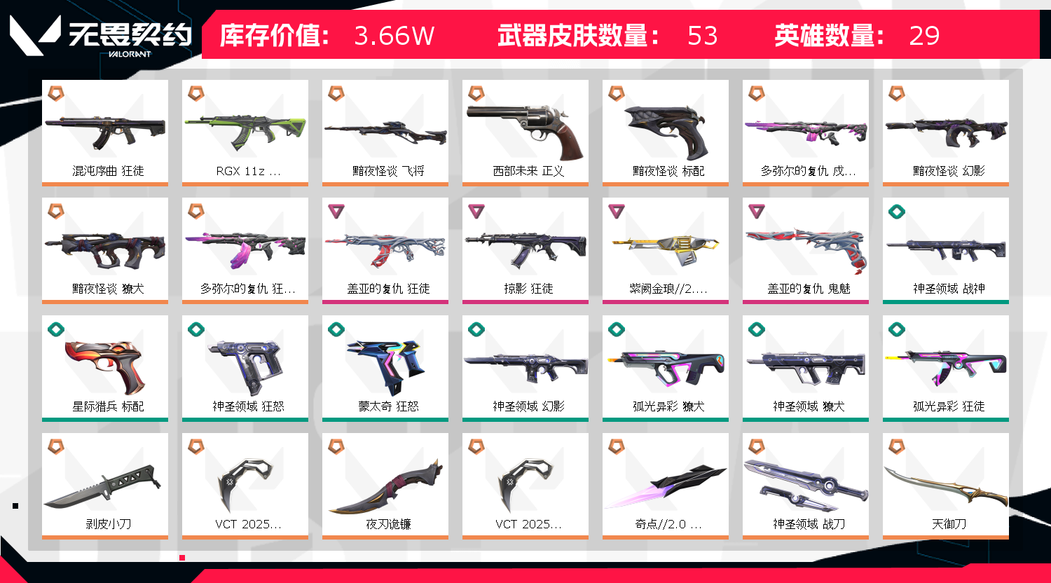 全神皮⭐VCT25爪刀⭐多弥尔狂徒和茂卫⭐蝴蝶刀⭐混沌狂徒⭐显卡狂徒⭐盖亚狂徒⭐掠影狂徒⭐金狼奥丁黯夜幻影;剥皮小刀,VCT 2025 爪刀,盖亚的复仇 狂徒,掠影 狂徒,RGX 11z Pro 狂徒,混沌序曲 狂徒,黯夜怪谈 飞将,
