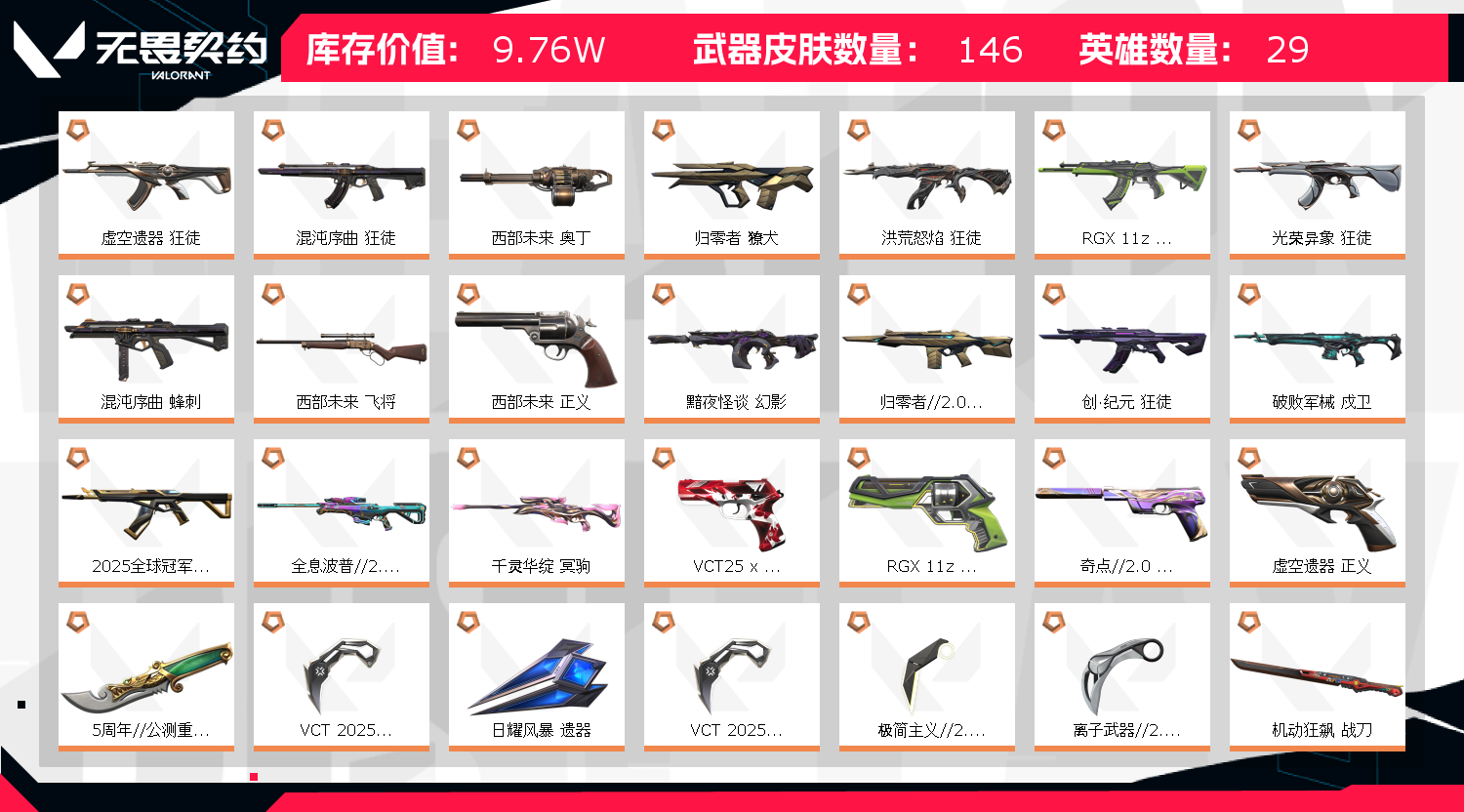 冻结请点击协助,会自动解冻,等几分钟重新登陆即可! 请勿挂机,游戏中挂机拉黑!!! 账号R点请勿使用,本店铺及时补充新套装,若使用R点无法升级新套装,攒R点辛苦,望谅解! 老板不要杀太多,现在风控的严重,杀多了会临时冻结,到时候我可能不在无法解冻!使用外挂脚本导致游戏账号封禁直接向平台提取ip地址! 本账号经过网络财产备案,一经发现直接报警处理立案追责,根据账号价值全额赔偿感谢支持谢谢合作谢谢合作!!!!禁止利用账号进行开挂、使用辅助违规软件诈骗等违规操作!;西部未来 奥丁,5周年//公测重制版 苍龙之刃,VCT 2025 爪刀,上古龙炎 判官,归零者 獠犬,盖亚的复仇 狂徒,虚空遗器 狂徒,