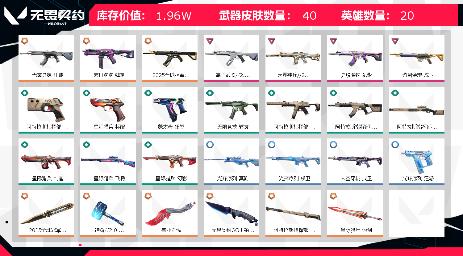 首页 > 租号大厅 > 无畏契约-wegame > wegame/wegame > 可排位 /25冠军套 /盖亚双手刀/神罚锤/光荣 离子狂徒/魔蛇 天界幻影/紫金戍卫/末日泡泡蜂刺