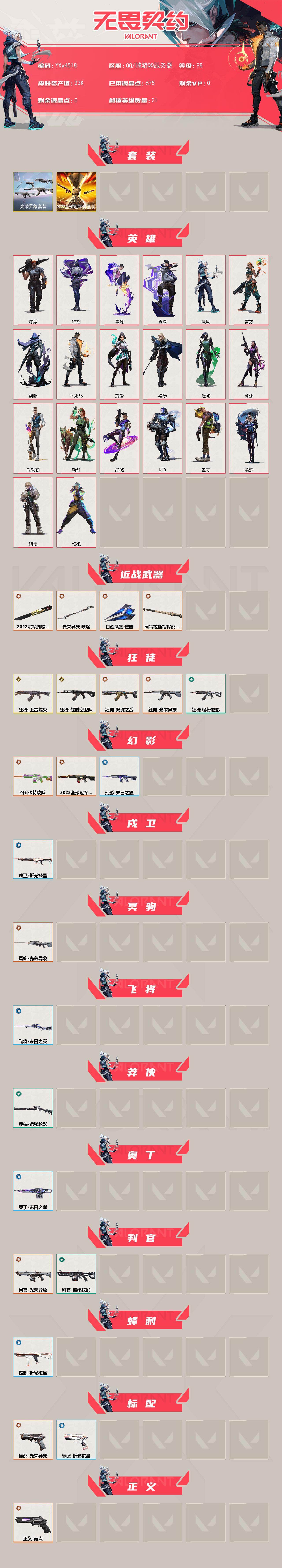冻结三分钟内解除,短信通知重新上即可!喜欢收藏不迷路、游戏异常进小黑屋、时间不够请提前续租或者不要开局 【套装】:2022全球冠军赛套装,光荣异象套装 【英雄】:幻棱,炼狱,维斯,暮蝶,壹决,捷风,雷兹,幽影,不死鸟,贤者,猎枭,蝰蛇,芮娜,尚勃勒,斯凯,星礈,K/O,盖可,黑梦,钢锁 【近战武器】:近战武器-2022全球冠军赛 蝴蝶刀,近战武器-光荣异象 歧途,近战武器-日耀风暴 遗器,近战武器-阿特拉斯指挥部 甩棍 【狂徒】:狂徒-上古龙炎,狂徒-超时空卫队,狂徒-双城之战,狂徒-光荣异象,狂徒-诡秘蛇影 【幻影】:幻影-2022全球冠军赛,幻影-砰砰X特攻队,幻影-末日之翼 【戍卫】:戍卫-折光棱晶 【冥驹】:冥驹-光荣异象 【飞将】:飞将-末日之翼 【莽侠】:莽侠-诡秘蛇影 【奥丁】:奥丁-末日之翼 【判官】:判官-光荣异象,判官-诡秘蛇影 【蜂刺】:蜂刺-折光棱晶 【标配】:标配-光荣异象,标配-折光棱晶 【正义】:正义-奇点 【短炮】:短炮-末日之翼 【卡面】:《双城之战》拥抱 卡面,精灵大战 卡面,欢迎来到底城 卡面,南瓜盛典 卡面,无畏契约GO!一卷:芮娜 卡面,无畏契约GO!一卷:零 卡面,《双城之战》金克丝 卡面,无畏契约GO!一卷:贤者 卡面,代号红色 卡面,新兵报到 卡面,V契约 卡面,无畏契约 卡面 【喷漆】:嘭! 喷漆,都算到了 喷漆,控场勿近 喷漆,买装还是存钱 喷漆,胜利属于无畏契约 喷漆,GLHF 喷漆,无畏契约 喷漆 【挂饰】:伞绳 挂饰,《双城之战》小蛋糕 挂饰,第九季//第三幕 纪念币 挂饰,薰衣草之心 挂饰,Z世代特饮 挂饰,天外飞客 挂饰,《双城之战》魄罗 挂饰,无畏契约 纪念币 挂饰;