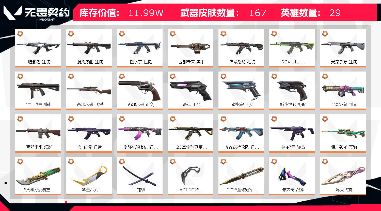 首页 > 租号大厅 > 无畏契约-wegame > wegame/wegame > 【25+22冠军套】颗秒军刀VCT苍龙刃镭切落樱飞旋魔术火花+24狂徒显卡超时空创纪元颗秒+14幻影