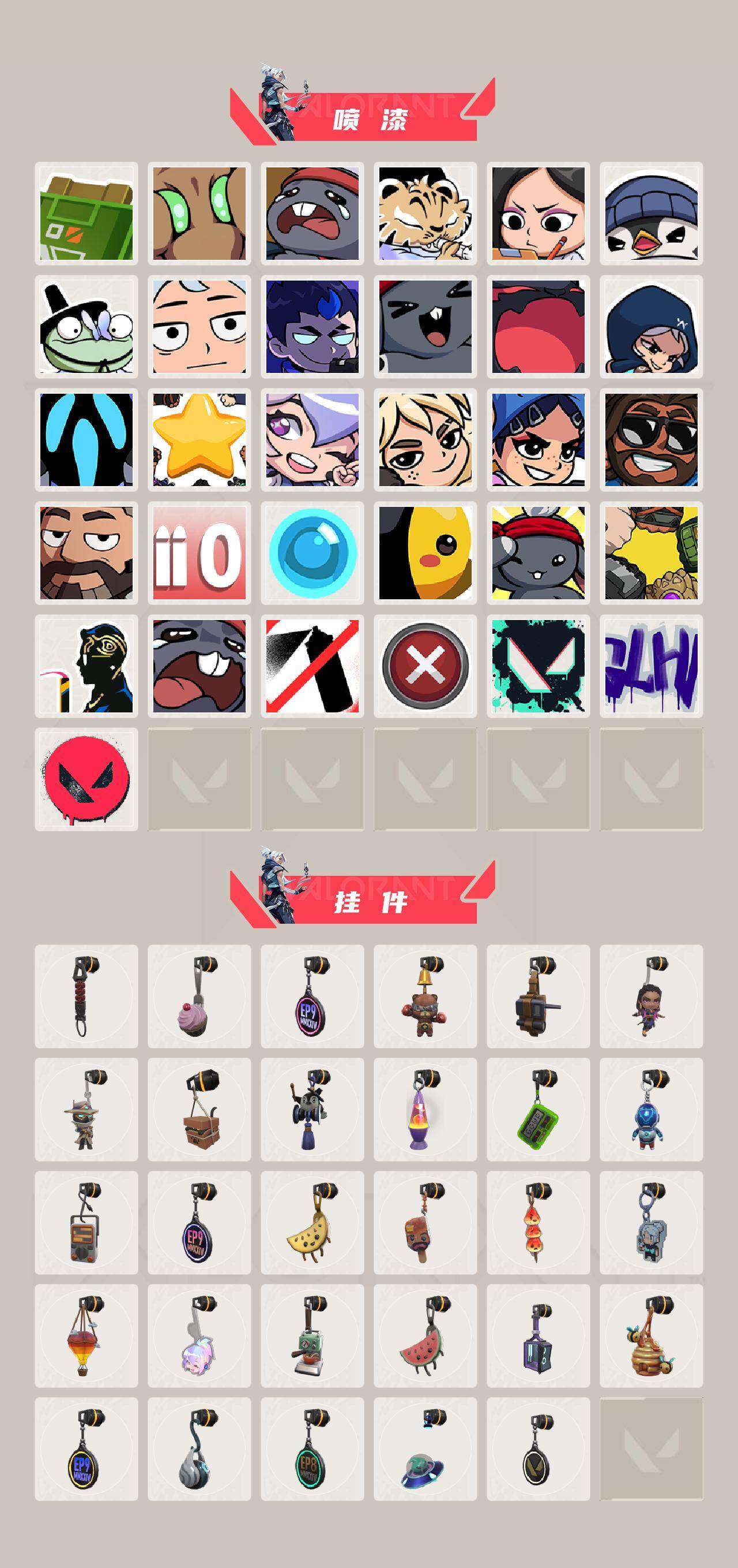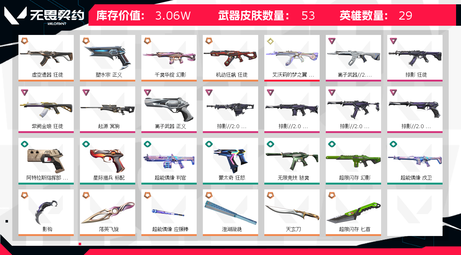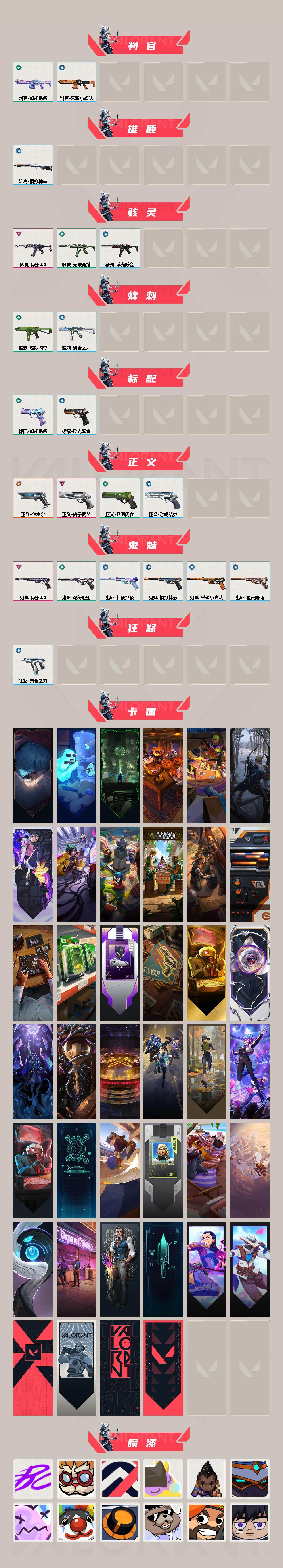 【套装】:掠影//2.0套装 【英雄】:幻棱,炼狱,维斯,暮蝶,钛狐,壹决,铁臂,捷风,雷兹,幽影,不死鸟,贤者,猎枭,蝰蛇,零,芮娜,奇乐,尚勃勒,霓虹,斯凯,夜露,星礈,K/O,海神,盖可,黑梦,钢锁 【近战武器】:近战武器-影钩,近战武器-落英飞旋,近战武器-澄湖滟,近战武器-超能偶像 应援棒,近战武器-超限闪存 匕首,近战武器-天玄刀 【狂徒】:狂徒-艾沃莉的梦之翼,狂徒-机动狂飙,狂徒-虚空遗器,狂徒-掠影,狂徒-紫阙金琅,狂徒-离子武器//2.0,狂徒-超能偶像 【幻影】:幻影-千灵华绽,幻影-掠影//2.0,幻影-超限闪存,幻影-聚合之力 【戍卫】:戍卫-超能偶像,戍卫-浮光跃金 【獠犬】:獠犬-采蜜小蜂队,獠犬-模拟赫兹 【冥驹】:冥驹-起源,冥驹-模拟赫兹 【飞将】:飞将-聚合之力 【莽侠】:莽侠-超限闪存 【战神】:战神-采蜜小蜂队,战神-浮光跃金 【奥丁】:奥丁-掠影//2.0 【判官】:判官-超能偶像,判官-采蜜小蜂队 【雄鹿】:雄鹿-模拟赫兹 【骇灵】:骇灵-掠影//2.0,骇灵-无限竞技,骇灵-浮光跃金 【蜂刺】:蜂刺-超限闪存,蜂刺-聚合之力 【标配】:标配-超能偶像,标配-浮光跃金 【正义】:正义-塑水宗,正义-离子武器,正义-超限闪存,正义-游戏结束 【鬼魅】:鬼魅-掠影//2.0,鬼魅-诡秘蛇影,鬼魅-采蜜小蜂队,鬼魅-模拟赫兹,鬼魅-扑棱扑棱,鬼魅-星云暗涌 【狂怒】:狂怒-聚合之力 【卡面】:《双城之战》拥抱 卡面,精灵大战 卡面,欢迎来到底城 卡面,南瓜盛典 卡面,唱片的故事 卡面,钢弓与箭弦 卡面,无畏契约:暮蝶 卡面,排除故障 卡面,战术桌游 卡面,悠享食光 卡面,修车达人 卡面,模拟赫兹 卡面,浮光跃金 卡面,超限闪存 卡面,维斯工牌 卡面,正义的化身 卡面,终章:生意人麦宝 卡面,铁之华 卡面,失而复得 卡面,时间到 卡面,最高舞台 卡面,复活专家 卡面,归乡 // 蝰蛇 卡面,超能偶像 卡面,生意人麦宝 卡面,声感陷阱设计图 卡面,Clutch 卡面,钢锁工牌 卡面,战术小伙伴的夏日 卡面,采蜜小蜂队 卡面,聚合之力 卡面,梦幻奶茶 卡面,无畏契约:尚勃勒 卡面,零点嗅探设计图 卡面,无畏契约GO!一卷:芮娜 卡面,无畏契约GO!一卷:零 卡面,代号红色 卡面,新兵报到 卡面,V契约 卡面,无畏契约 卡面 【喷漆】:嘭! 喷漆,都算到了 喷漆,控场勿近 喷漆,皮蛋呼呼 喷漆,像素星礈 喷漆,图谋不轨的零 喷漆,伤心心 喷漆,小丑猫 喷漆,模拟赫兹 喷漆,高丽风情小熊 喷漆,蹲到一个 喷漆,全力集中 喷漆,超限闪存 喷漆,RUA一下 喷漆,熊抱 喷漆,高丽风情小虎 喷漆,记在小本本 喷漆,防弹鹅 喷漆,高丽风情小蛙 喷漆,又被闪了 喷漆,终极羞辱 喷漆,超级粉丝 喷漆,黯兽卖萌 喷漆,捷风差距 喷漆,惊声尖叫 喷漆,五人成星 喷漆,超能偶像 喷漆,放我出去 喷漆,掩护我 喷漆,大佬发枪 喷漆,边缘试探 喷漆,拼一枪 喷漆,聚合之力 喷漆,采蜜小蜂队 喷漆,梦幻小队 喷漆,五个全都齐了 喷漆,致命优雅 喷漆,我的刀呢? 喷漆,禁止喷漆 喷漆,买装还是存钱 喷漆,胜利属于无畏契约 喷漆,GLHF 喷漆,无畏契约 喷漆 【挂饰】:伞绳 挂饰,《双城之战》小蛋糕 挂饰,第九季//第三幕 纪念币 挂饰,拳击战术熊 挂饰,工具腰带 挂饰,无畏契约GO!一卷 芮娜 挂饰,无畏契约GO!一卷 零 挂饰,暗藏猫腻 挂饰,高丽风情 挂饰,熔岩灯 挂饰,超限闪存 挂饰,迷你K/O 挂饰,模拟赫兹 挂饰,第九季//第二幕 纪念币 挂饰,终章:这瓜保熟 挂饰,炼狱雪糕 挂饰,糖葫芦 挂饰,袖珍捷风 挂饰,冲上云霄 挂饰,超能偶像 挂饰,迷你浓缩 挂饰,这瓜保熟 挂饰,动力机箱 挂饰,采蜜小蜂队 挂饰,第九季//一幕 纪念币 挂饰,聚合之力 挂饰,第八季//第三幕 纪念币 挂饰,天外飞客 挂饰,无畏契约 纪念币 挂饰;虚空遗器 狂徒,掠影 狂徒,紫阙金琅 狂徒,离子武器//2.0 狂徒,起源 冥驹,塑水宗 正义,离子武器 正义,