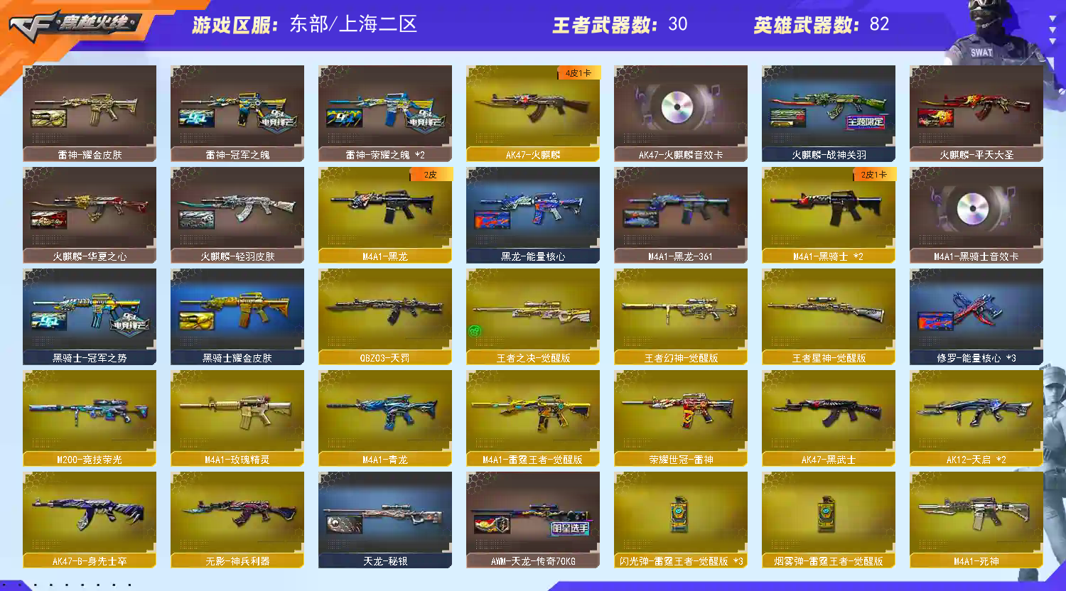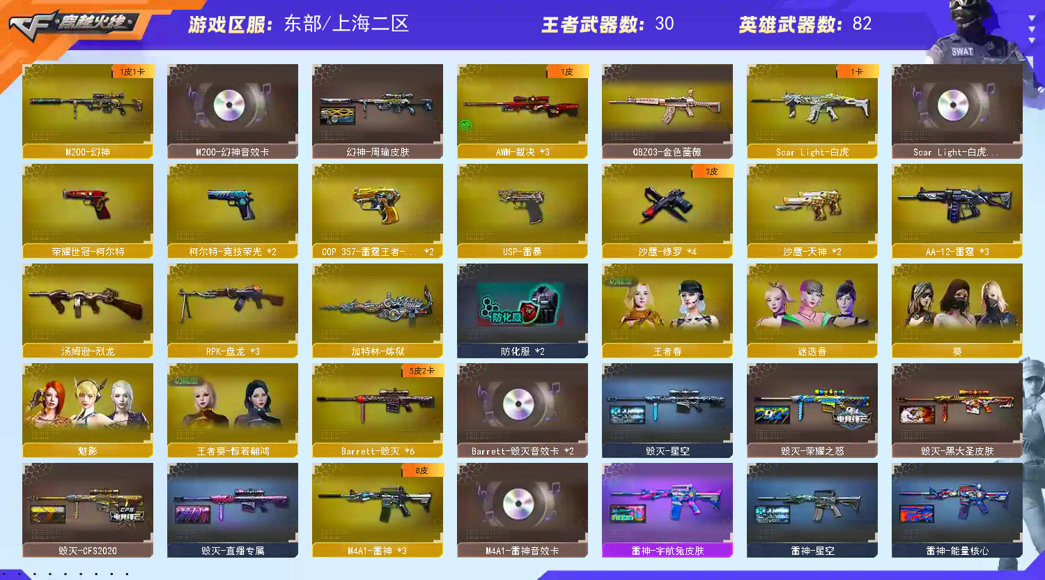 【上海二区】【V武器数85】【幻神三件套】【幻神1皮】【白虎三件套】【竞技荣光套装X7套】【M200-幻神】【幻神-周瑜皮肤】【M200-幻神音效卡】【M200-竞技荣光】【王者幻神-觉醒版】【王者星神-觉醒版】【AWM-裁决】【Scar Light-白虎】【白虎-电玩粉兔皮肤】【Scar Light-白虎音效卡】【QBZ03-金色蔷薇】【QBZ03-天罚】【M4A1-雷霆王者-觉醒版】【M4A1-青龙】【USP-雷暴】【荣耀世冠-柯尔特】【柯尔特-竞技荣光】【COP 357-雷霆王者-觉醒版】【加特林-炼狱】【RPK-盘龙】【魂·炼狱-玩具枪】【汤姆逊-烈龙】【葵】【迷迭香】【王者春】【王者葵-惊若翩鸿】【魅影】【M4A1-雷神】【雷神-荣耀之魄】【雷神-冠军之魄】【雷神-宇航兔皮肤】【雷神-能量核心】【雷神-耀金皮肤】【雷神-星空】【M4A1-雷神音效卡】【AK47-火麒麟】【火麒麟-华夏之心】【火麒麟-轻羽皮肤】【火麒麟-战神关羽】【火麒麟-平天大圣】【火麒麟-CFSTAR】【火麒麟-雷神】【AK47-火麒麟音效卡】【M4A1-黑骑士】【黑骑士-冠军之势】【黑骑士耀金皮肤】【M4A1-黑骑士音效卡】【M4A1-黑龙】【M4A1-黑龙-361】【黑龙-能量核心】【Barrett-毁灭】【毁灭-荣耀之怒】【巴雷特-毁灭-CFPL冠军】【毁灭-CFS2020】【毁灭-星空】【毁灭-直播专属 】【毁灭-黑大圣皮肤】【Barrett-毁灭音效卡】;USP-雷暴,荣耀世冠-柯尔特,RPK-盘龙,QBZ03-金色蔷薇,M200-幻神,Scar Light-白虎,
