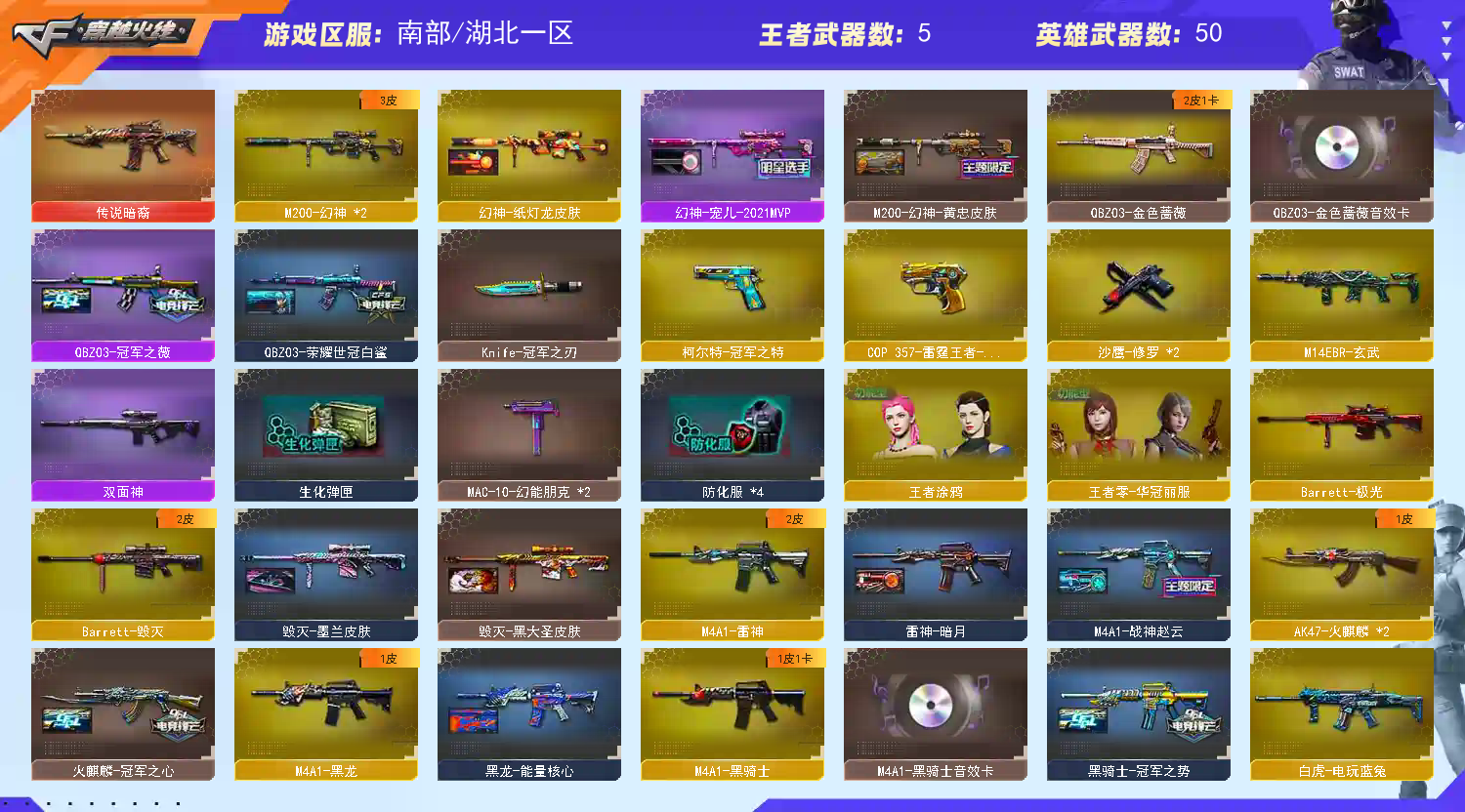 【角色】奇洋探员,乔伊教练,蛇隐宗,王者零-华冠丽服,王者涂鸦,云海玲珑, 【主武器】传说暗裔,M200-幻神,AK47-火麒麟,M4A1-黑龙,M4A1-雷神,M4A1-黑骑士,M14ebr-玄武,M4A1-神工天巧。无影-神兵利器,黑武士-锦绣游龙,超新星-热带奇洋。金色蔷薇-古蛇迷踪,QBZ03-金色蔷薇,烈火-动感闪耀,AK47-B-战神,黑骑士 -海王,白虎-电玩蓝兔,Barrett-毁灭,Barrett-极光,m200-竞技荣光,Barrett-暗月传说。烈龙-云海游龙,炫金骑士,王者白虎,王者龙血, 【副武器】沙鹰-修罗,天神-动感闪耀,修罗-古蛇迷踪,柯尔特-冠军之特,COP 357-雷霆王者, 【近身武器】屠龙。擎天,麒麟刺,屠龙-动感闪耀,擎天-云海游龙,龙啸-热带奇洋,龙啸-烈火龙威, 【投掷武器】竞技荣光套,神工天巧套,云龙要,幻灵套, 【音效卡】QBZ03-金色蔷薇音效卡,M4A1-黑骑士音效卡, 【皮肤】幻神-纸灯笼皮肤,擎天-傲竹金色皮肤,幻神-宠儿-2021mvp,M200-幻神-黄忠皮肤,雷神-源计划2.0专属皮肤,QBZ03-冠军之薇,M4A1-战神赵云,黑龙-能量核心,AK47-B-常胜将军-刘备,AK47-B-常胜将军-孙权,战神-粉色甜心皮肤,雷神-暗月,毁灭-墨兰皮肤,黑骑士-冠军之势,QBZ03-荣耀世冠白鲨,修罗-CFSTAR,毁灭-黑大圣皮肤,AK47老兵传说皮肤,天龙-CFSTAR,火麒麟-冠军之心,;柯尔特-冠军之特,Knife-冠军之刃,QBZ03-金色蔷薇,M200-幻神,传说暗裔,