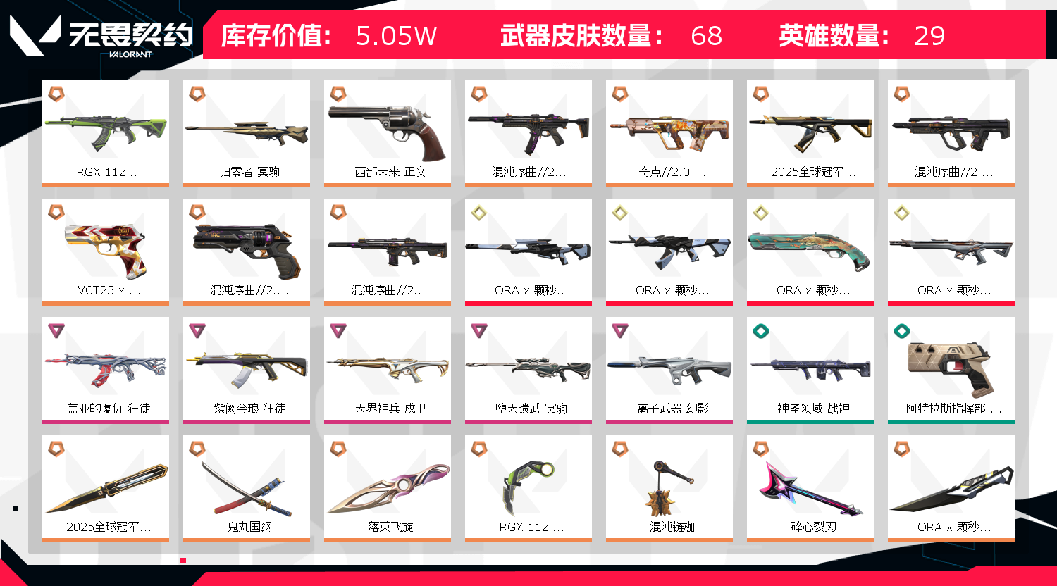 允许 英雄28 武器皮肤数量67;盖亚的复仇 狂徒,紫阙金琅 狂徒,RGX 11z Pro 狂徒,天界神兵 戍卫,堕天遗武 冥驹,归零者 冥驹,西部未来 正义,