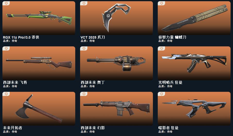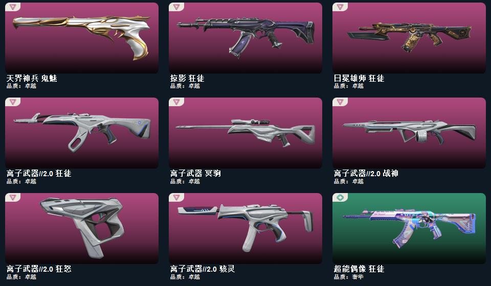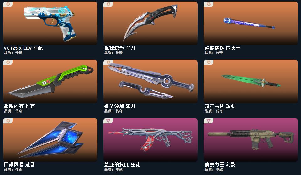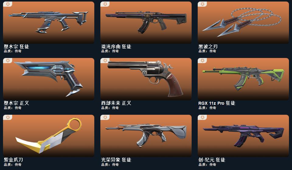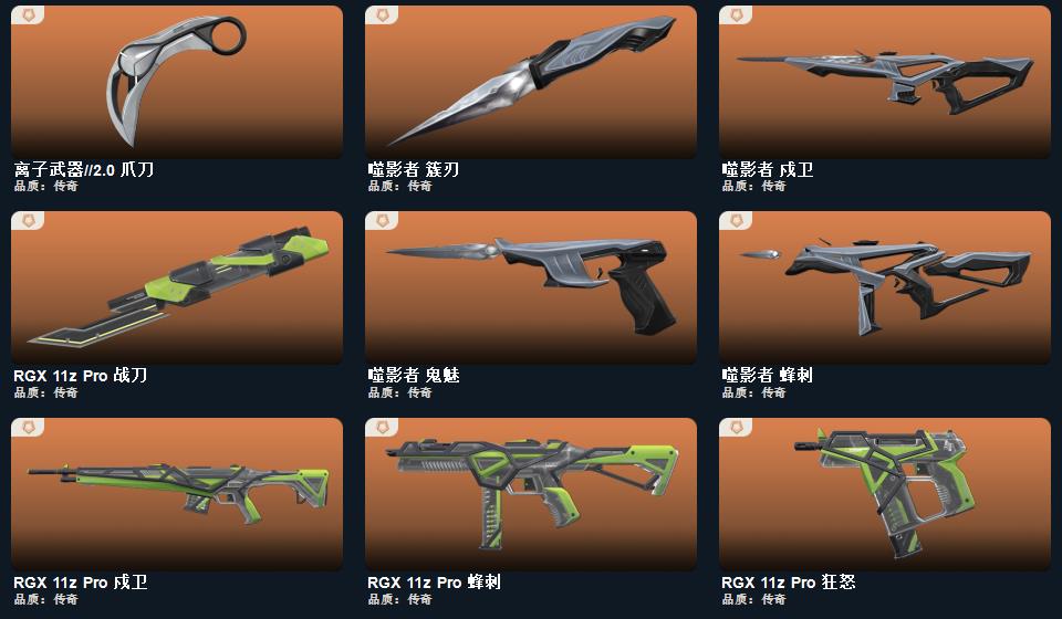 wegame无畏契约★碎心裂刃,星际猎兵 短剑,阿特拉斯指挥部 甩棍,日耀风暴 遗器,黑波之刃,镭切,神之刃,诡秘蛇影 军刀,离子武器//2.0 爪刀,夜刃诡镰,穿花蝴蝶,甜心猎手 短炮,诛心猎手 正义,幻心猎手 鬼魅,光环序列 狂怒,瑰梦艺语 鬼魅,星际猎兵 标配,太空穿梭 正义