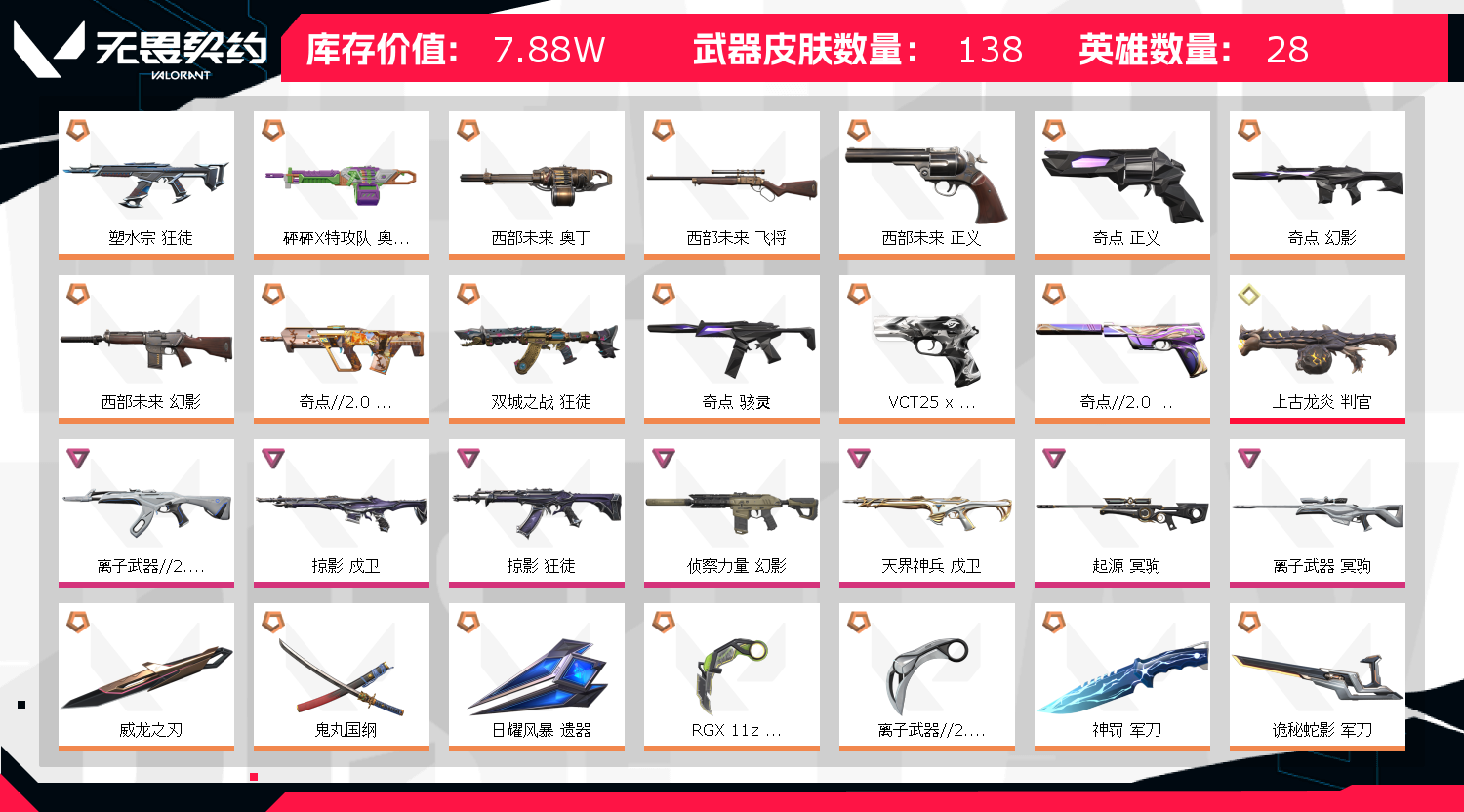 首页 > 租号大厅 > 无畏契约-wegame > wegame/wegame > 别杀太多 可排位7.8w库存137皮 奇点套 西部套 离子套 掠夺套