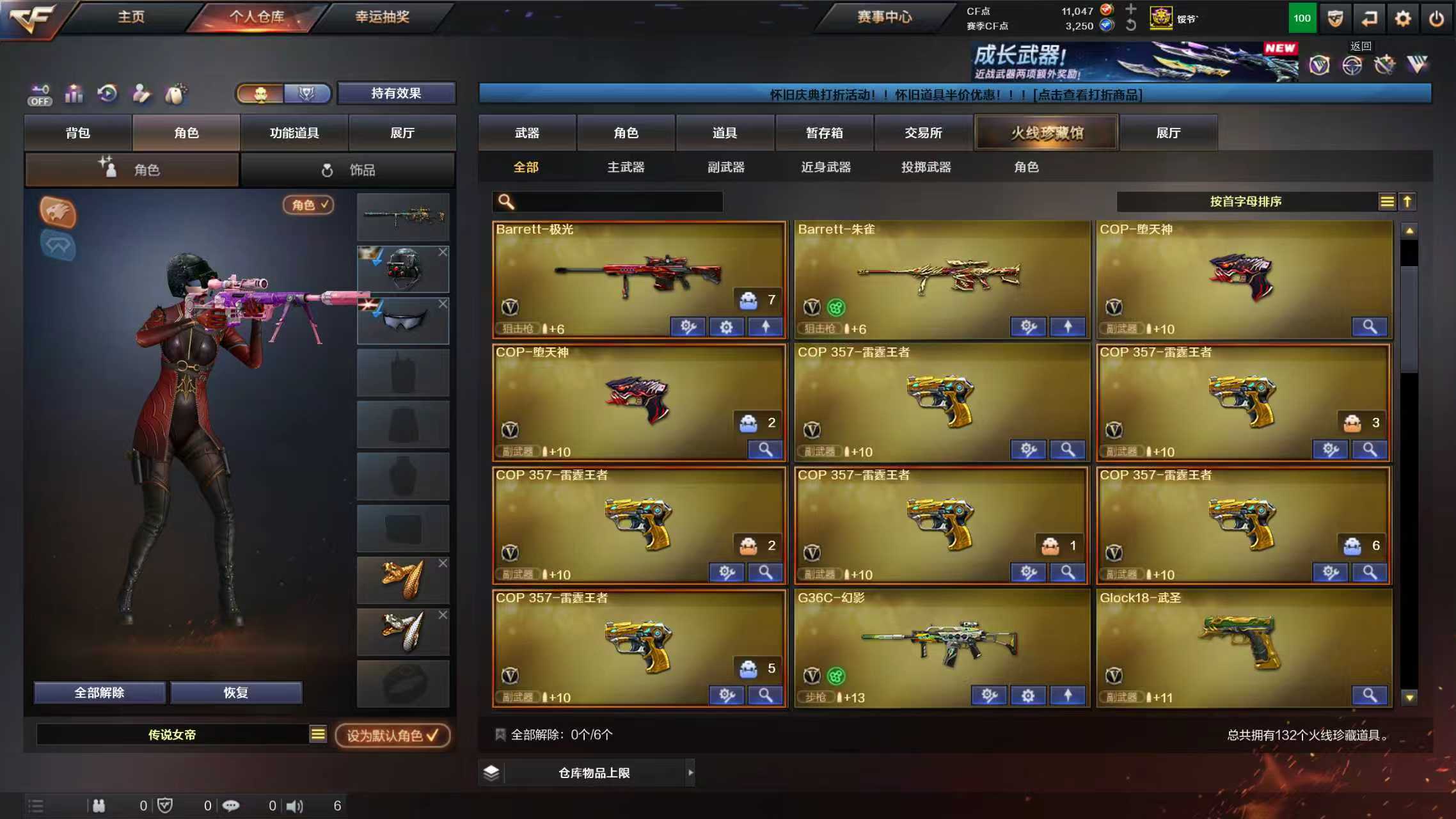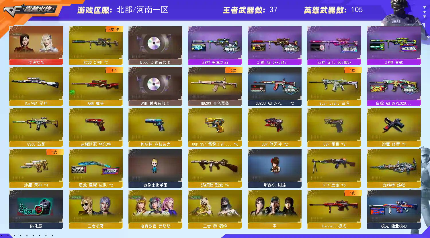 女帝8cop双雷暴双柯尔特,四幻神四皮肤,裁决毁灭,雷神全部带音效卡。6烈。双白虎,双QBZ,98k