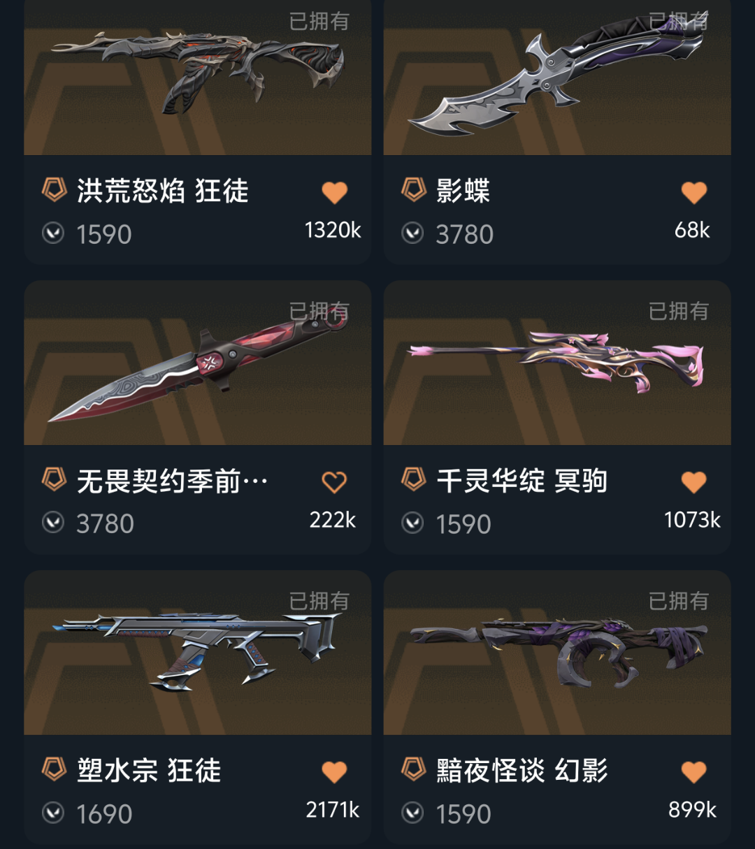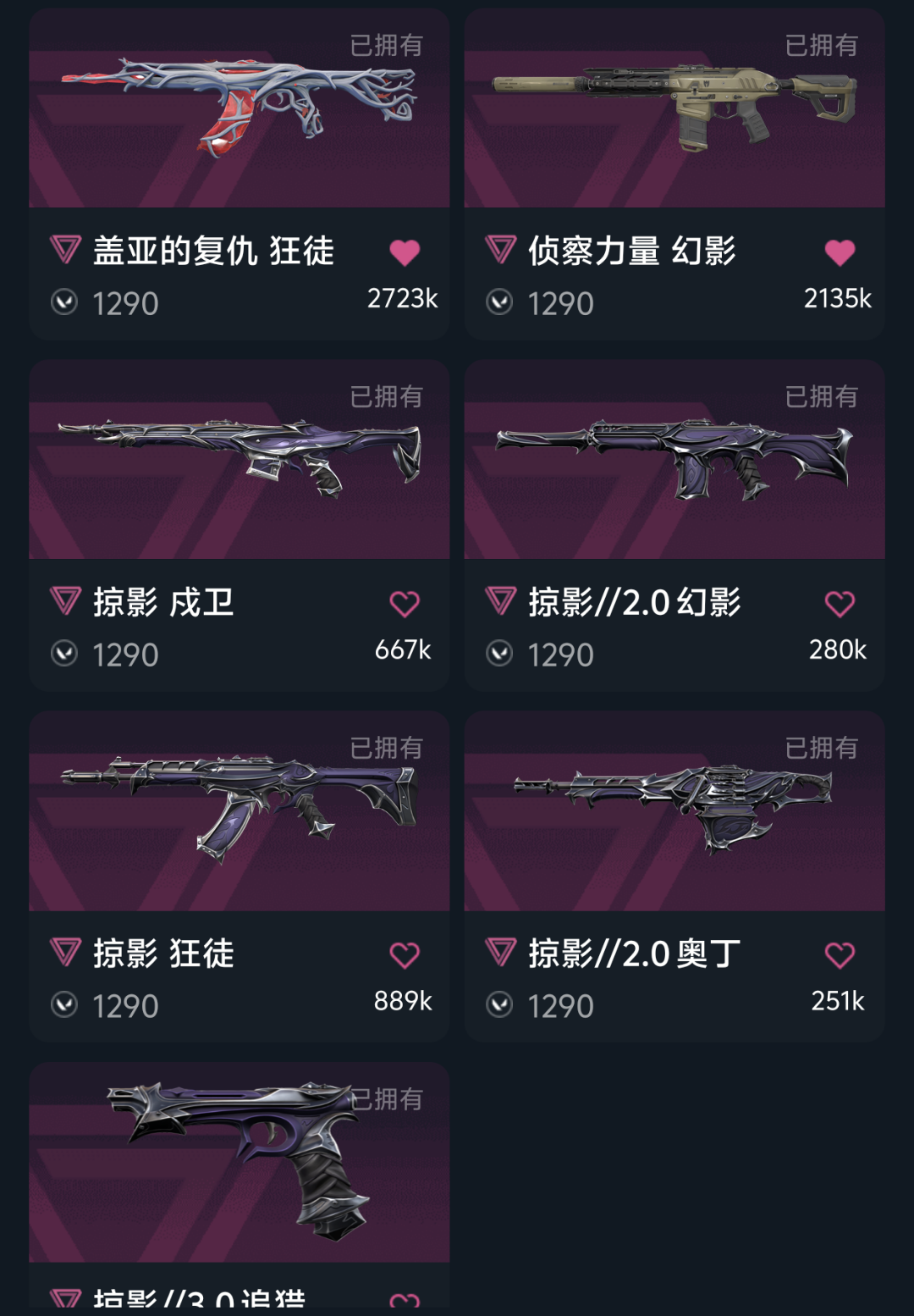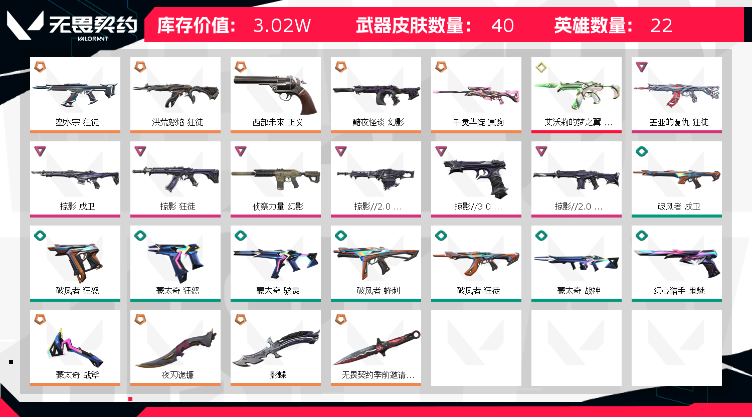 允许 英雄17 武器皮肤数量25;盖亚的复仇 狂徒,掠影 戍卫,洪荒怒焰 狂徒,掠影 狂徒,侦察力量 幻影,塑水宗 狂徒,西部未来 正义,