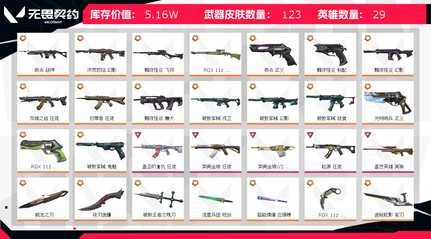 可排位 英雄28 武器皮肤数量122;奇点 战神,威龙之刃,盖亚的复仇 狂徒,洪荒怒焰 幻影,紫阙金琅 狂徒,黯夜怪谈 飞将,RGX 11z Pro//3.0 莽侠,