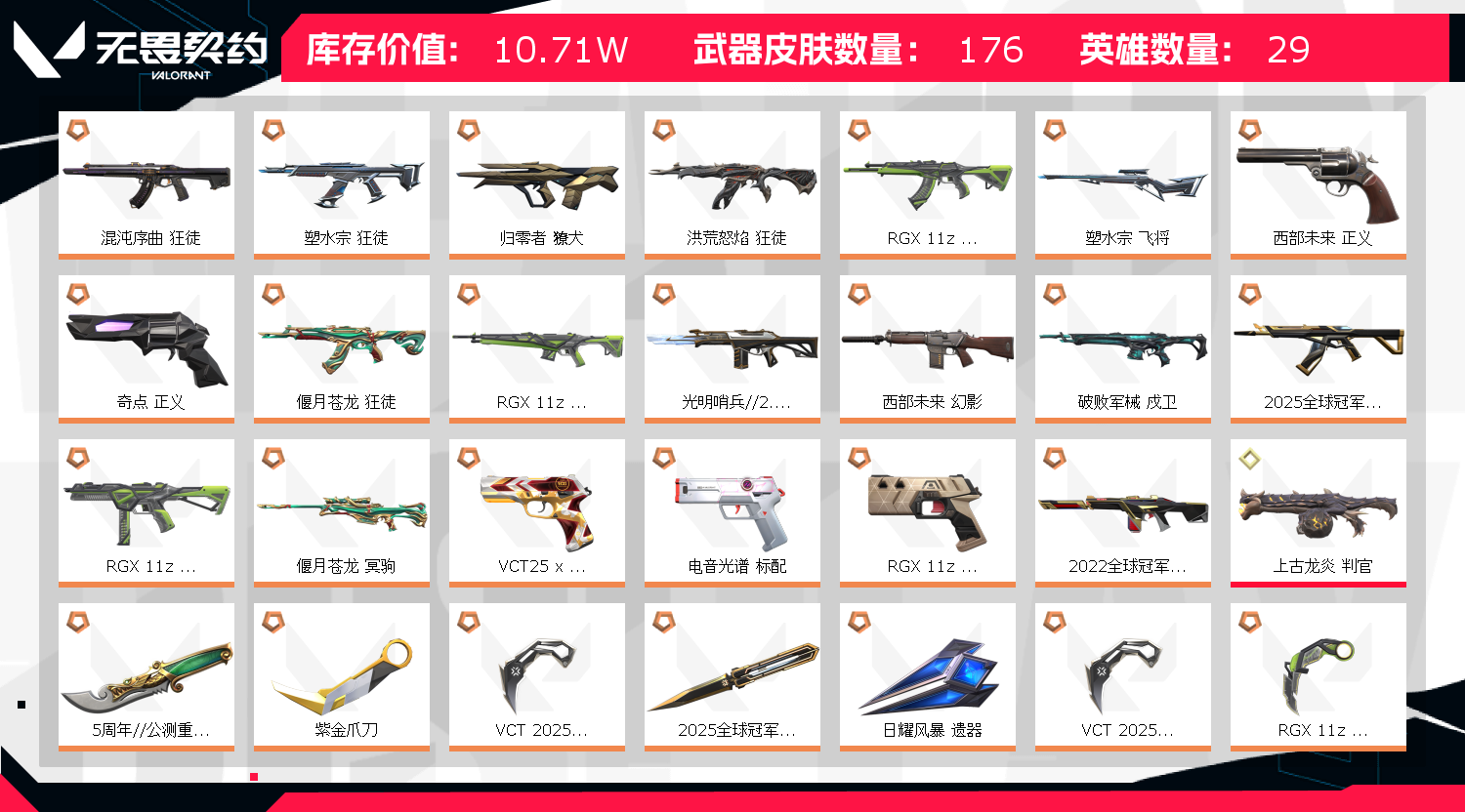 首页 > 租号大厅 > 无畏契约-wegame > wegame/wegame > 22、25冠军套🔥VCT、显卡爪刀,奇点蝴蝶刀✅盖亚、塑水、混沌狂徒✅侦查幻影猫猫鬼魅,时空卫队套