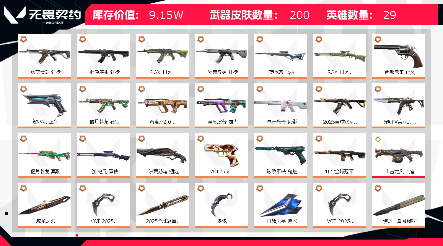 首页 > 租号大厅 > 无畏契约-wegame > wegame/wegame > 精氪毕业皮齐全特效炫彩拉满拉爆⚡22·25冠军掠影2威龙套⚡盖亚艾沃莉混沌超时空⚡影钩VCT爪⚡侦查