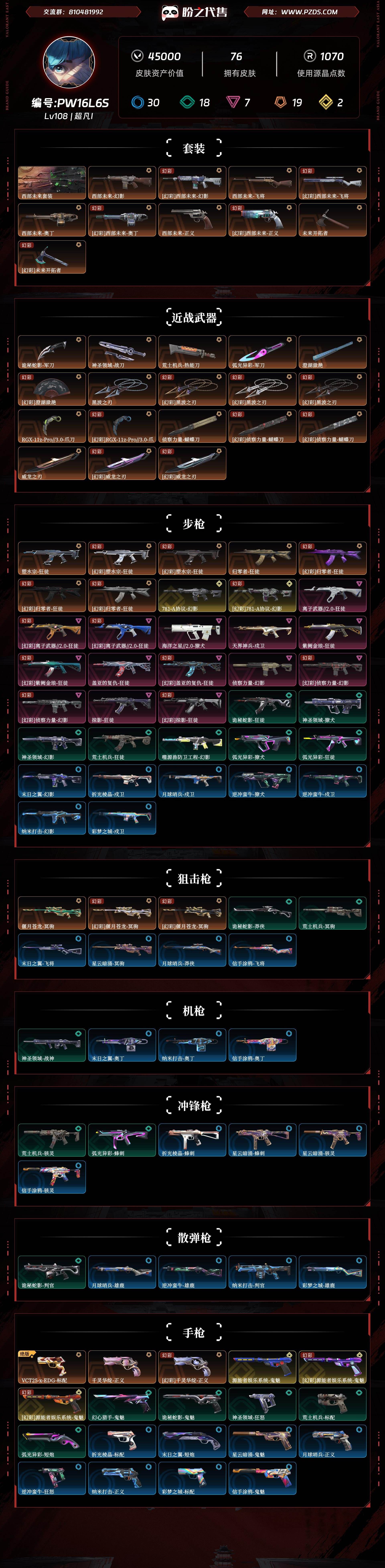 【拥有套装】西部未来套装(西部未来-幻影,西部未来-奥丁,西部未来-飞将,西部未来-正义,未来开拓者) 【拥有近战武器】澄湖,黑波之刃,RGX-11z-Pro//3.0-爪刀,侦察力量-蝴蝶刀,威龙之刃, 【拥有步枪】塑水宗-狂徒,归零者-狂徒,781-A协议-幻影,离子武器//2.0-狂徒,海洋之星//2.0-獠犬,天界神兵-戍卫,紫阙金琅-狂徒,盖亚的复仇-狂徒,侦察力量-幻影,掠影-狂徒 【拥有狙击枪】偃月苍龙-冥驹 【拥有手枪】VCT25-x-EDG-标配,千灵华绽-正义,源能者娱乐系统-鬼魅;西部未来 奥丁,黑波之刃,威龙之刃,盖亚的复仇 狂徒,掠影 狂徒,侦察力量 幻影,紫阙金琅 狂徒,