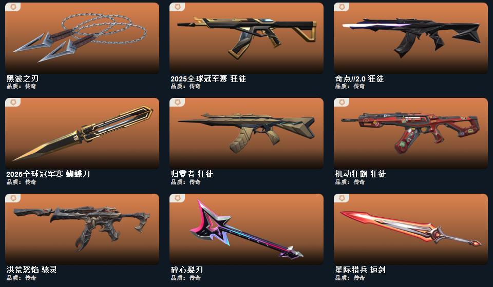 wegame无畏契约★武器皮肤数量:35,幻心猎手 鬼魅,诛心猎手 正义,甜心猎手 短炮,星际猎兵 标配,光环序列 狂怒,瑰梦艺语 鬼魅 甜心猎手 蜂刺,无限竞技 骇灵,洪荒怒焰 骇灵,瑰梦艺语 骇灵 甜心猎手 幻影,甜心猎手 戍卫,幻心猎手 狂徒,日冕雄师 狂徒,诛心猎手 獠犬,2025全球冠军赛 狂徒,奇点//2.0 狂徒,瑰梦艺语 狂徒,机动狂飙 狂徒,光环序列 戍卫,归零者 狂徒,星际猎兵 幻影