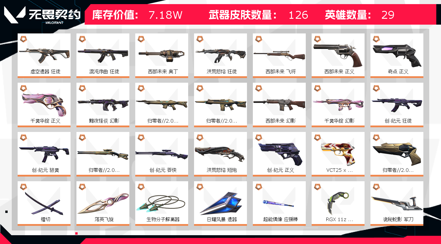 首页 > 租号大厅 > 无畏契约-wegame > wegame/wegame > 秒解冻7w库存三棱军刺🌸创纪元套西部套归零2.0套🌸盖亚混沌紫金离子龙ak🌸侦查幻影奇点正义