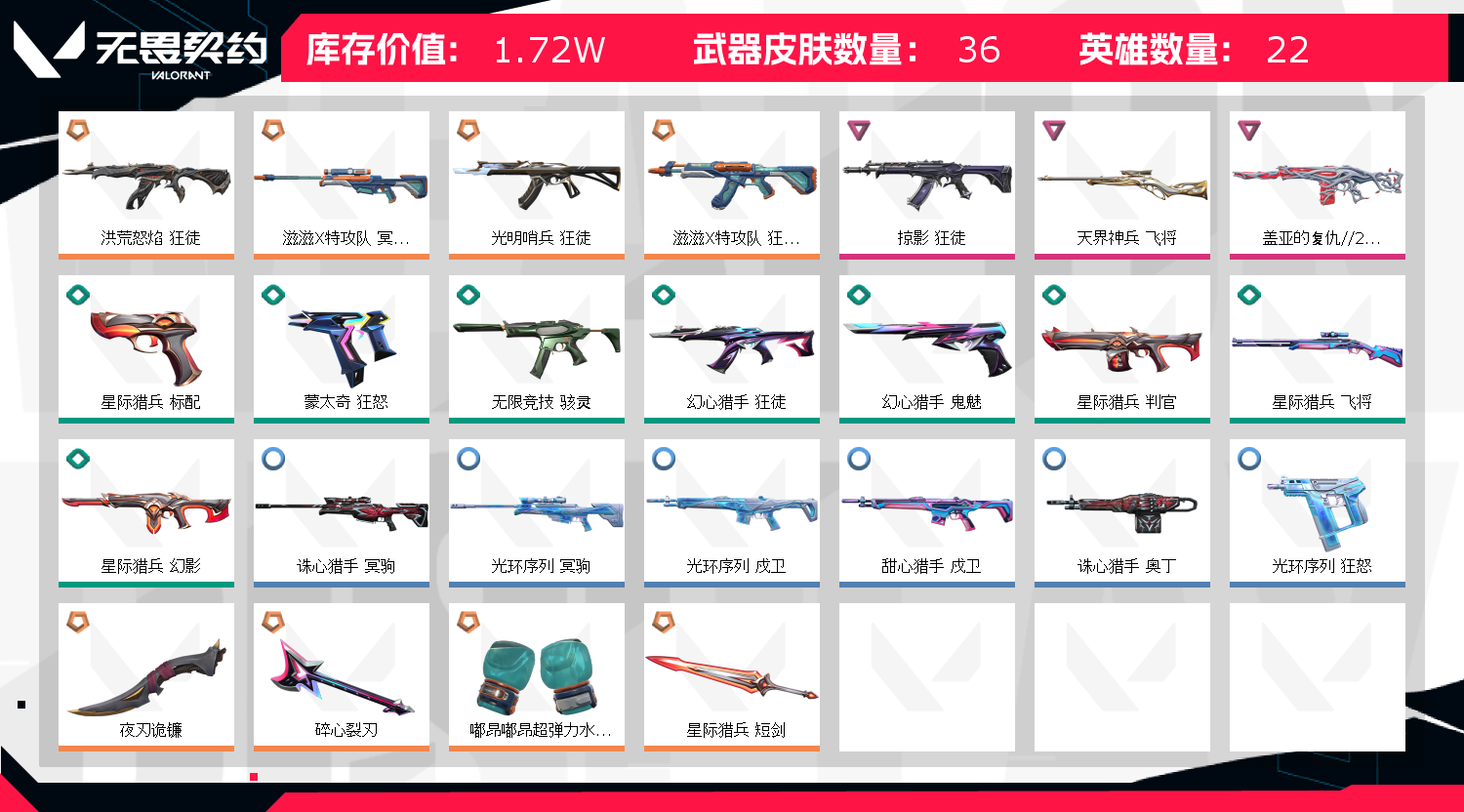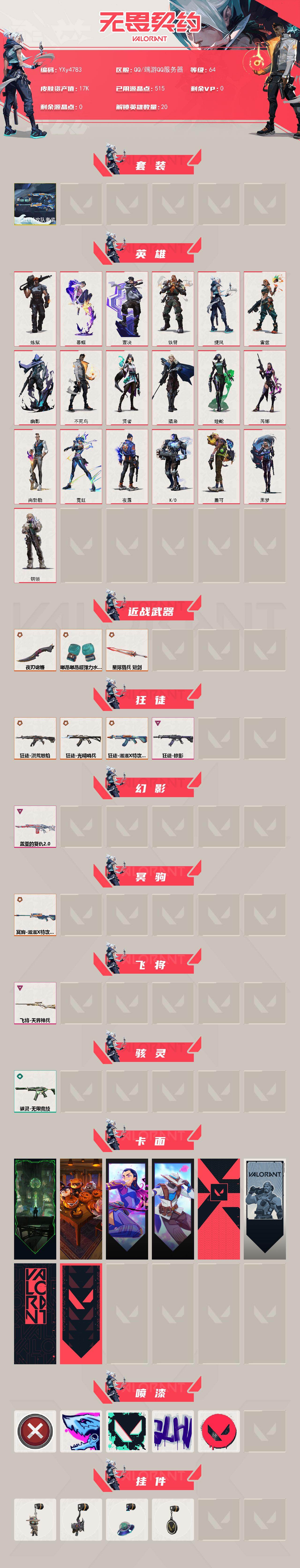 【套装】:滋滋X特攻队套装 【英雄】:炼狱,暮蝶,壹决,铁臂,捷风,雷兹,幽影,不死鸟,贤者,猎枭,蝰蛇,芮娜,尚勃勒,霓虹,夜露,K/O,盖可,黑梦,钢锁 【近战武器】:近战武器-嘟昂嘟昂超弹力水球拳套,近战武器-夜刃诡镰,近战武器-星际猎兵 短剑 【狂徒】:狂徒-光明哨兵,狂徒-洪荒怒焰,狂徒-滋滋X特攻队,狂徒-掠影 【幻影】:幻影-盖亚的复仇//2.0 【冥驹】:冥驹-滋滋X特攻队 【飞将】:飞将-天界神兵 【骇灵】:骇灵-无限竞技 【卡面】:欢迎来到底城 卡面,南瓜盛典 卡面,无畏契约GO!一卷:芮娜 卡面,无畏契约GO!一卷:零 卡面,代号红色 卡面,新兵报到 卡面,V契约 卡面,无畏契约 卡面 【喷漆】:买装还是存钱 喷漆,暴走萝莉 喷漆,胜利属于无畏契约 喷漆,GLHF 喷漆,无畏契约 喷漆 【挂饰】:无畏契约GO!一卷 零 挂饰,鱼骨头 挂饰,天外飞客 挂饰,无畏契约 纪念币 挂饰;洪荒怒焰 狂徒,掠影 狂徒,天界神兵 飞将,