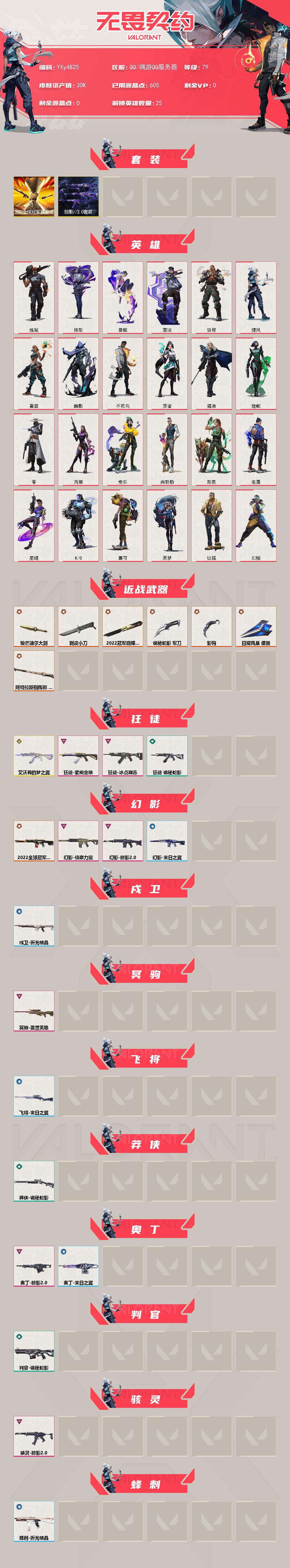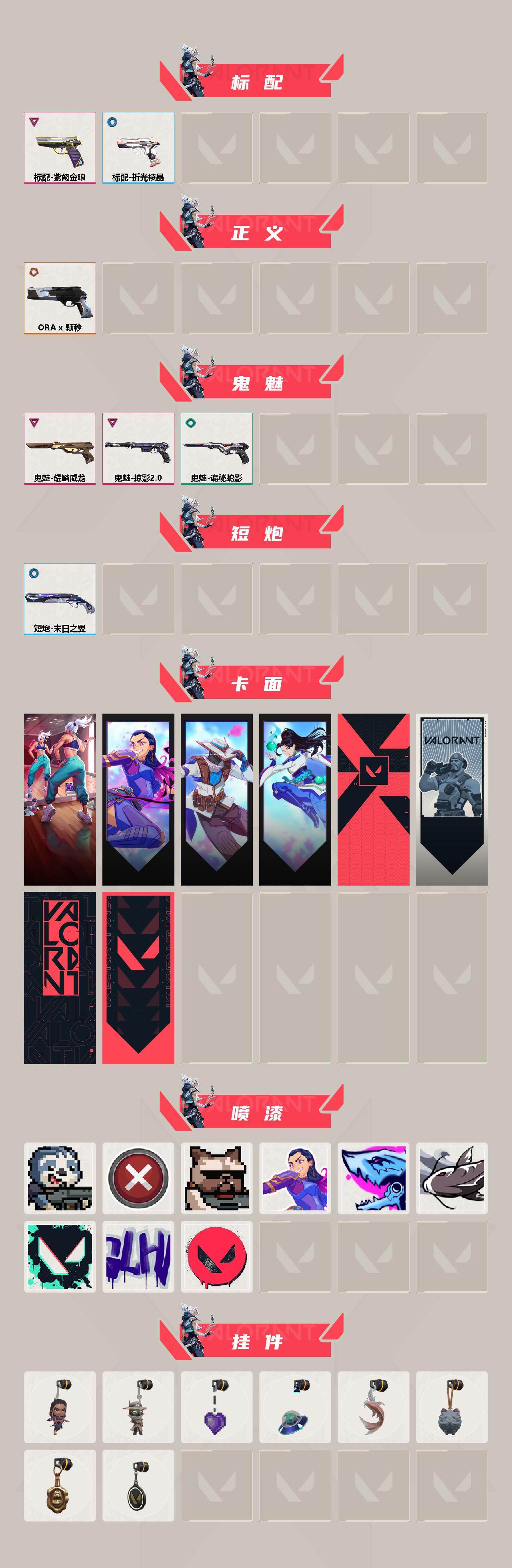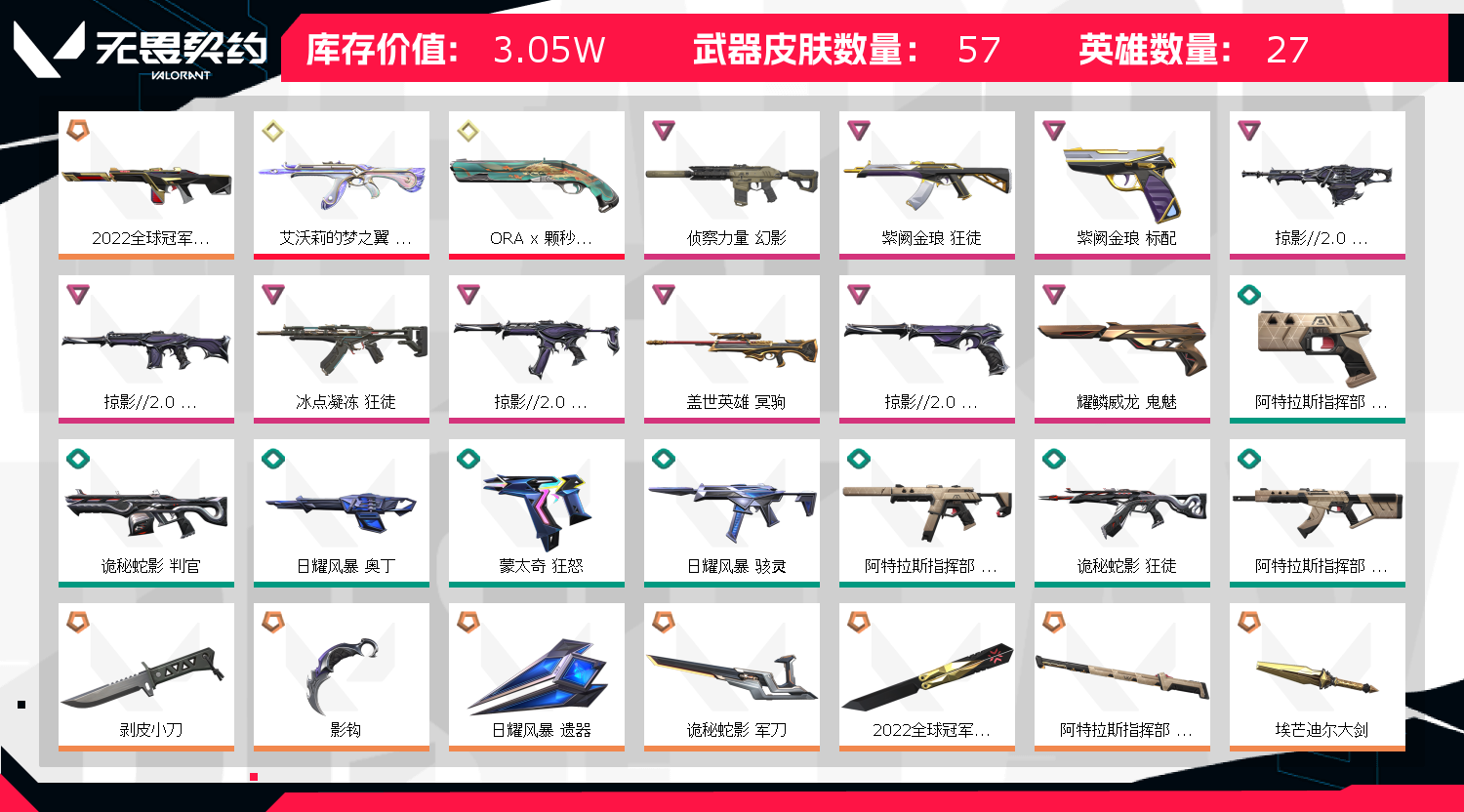 【套装】:2022全球冠军赛套装,掠影//2.0套装 【英雄】:幻棱,炼狱,维斯,暮蝶,钛狐,壹决,铁臂,捷风,雷兹,幽影,不死鸟,贤者,猎枭,蝰蛇,零,芮娜,奇乐,尚勃勒,斯凯,夜露,星礈,K/O,盖可,黑梦 【近战武器】:近战武器-2022全球冠军赛 蝴蝶刀,近战武器-影钩,近战武器-剥皮小刀,近战武器-埃芒迪尔大剑,近战武器-诡秘蛇影 军刀,近战武器-日耀风暴 遗器,近战武器-阿特拉斯指挥部 甩棍 【狂徒】:狂徒-艾沃莉的梦之翼,狂徒-冰点凝冻,狂徒-紫阙金琅,狂徒-诡秘蛇影 【幻影】:幻影-2022全球冠军赛,幻影-侦察力量,幻影-掠影//2.0,幻影-末日之翼 【戍卫】:戍卫-折光棱晶 【冥驹】:冥驹-盖世英雄 【飞将】:飞将-末日之翼 【莽侠】:莽侠-诡秘蛇影 【奥丁】:奥丁-掠影//2.0,奥丁-末日之翼 【判官】:判官-诡秘蛇影 【骇灵】:骇灵-掠影//2.0 【蜂刺】:蜂刺-折光棱晶 【标配】:标配-紫阙金琅,标配-折光棱晶 【正义】:正义-ORA x 颗秒 【鬼魅】:鬼魅-耀鳞威龙,鬼魅-掠影//2.0,鬼魅-诡秘蛇影 【短炮】:短炮-末日之翼 【卡面】:热舞环节 卡面,无畏契约GO!一卷:芮娜 卡面,无畏契约GO!一卷:零 卡面,无畏契约GO!一卷:贤者 卡面,代号红色 卡面,新兵报到 卡面,V契约 卡面,无畏契约 卡面 【喷漆】:审判之爪 喷漆,买装还是存钱 喷漆,关门放狗 喷漆,无畏契约GO!一卷:芮娜 喷漆,暴走萝莉 喷漆,松叶 喷漆,胜利属于无畏契约 喷漆,GLHF 喷漆,无畏契约 喷漆 【挂饰】:无畏契约GO!一卷 芮娜 挂饰,无畏契约GO!第卷 零 挂饰,薰衣草之心 挂饰,天外飞客 挂饰,红鳞松叶 挂饰,《双城之战》魄罗 挂饰,海豹的认可 挂饰,无畏契约 纪念币 挂饰;剥皮小刀,侦察力量 幻影,紫阙金琅 狂徒,紫阙金琅 标配,